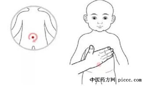 脾寒腹痛是导致夜啼的常见原因。南宋御医陈文中《陈氏小儿病源方论》中的《养子十法》篇提出“脾胃要温”。脾胃属土,喜温畏寒。若是由于养护不当,小儿腹部受寒;又或者是用冷乳哺食,导致寒邪内侵,则表现为夜间啼哭,尤其下半夜哭得厉害,面色发青发白,手脚较凉,喜欢俯卧,腹部发凉,弯腰蜷腿哭闹,不吮乳,常常伴有大便稀软不成形。推拿时增加以下穴位。
