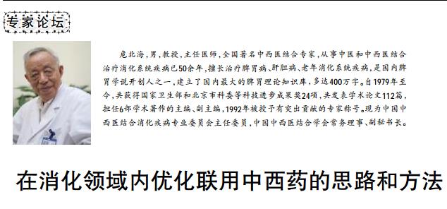 作者简介:危北海, 男, 教授, 主任医师, 全国著名中西医结合专家,从事中医和中西医结合治疗消化系统疾病已50余年, 擅长治疗脾胃病、肝胆病、 老年消化系统疾病, 是国内脾胃学说开创人之一, 建立了国内最大的脾胃理论知识库, 多达400万字。 自1979年至今, 共获得国家卫生部和北京市科委等科技进步成果奖24项, 共发表学术论文112篇,担任6部学术著作的主编、 副主编, 1992年被授予有突出贡献的专家称号。 现为中国中西医结合消化疾病专业委员会主任委员,中国中西医结合学会常务理事、 副秘书长。
