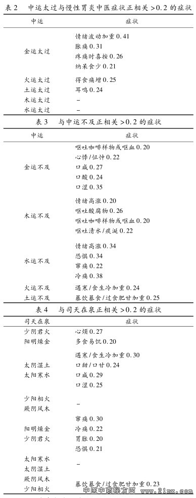 ÂýÐÔθÑ×( CG) ÊÇÁÙ´²³£¼û²¡¡¢ ¶à·¢²¡£¬ ·¢²¡Âʽϸߣ¬ Ô¼ Õ¼ÄÚ¾µ¼ì²éÕßµÄ 80% ¡« 90% £Û1 £Ý ¡£¸Ã²¡Óëθ°©µÄ·¢ÉúÃÜÇÐ Ïà¹Ø£¬ ÑÏÖØÓ°Ï컼ÕßÉú»îÖÊÁ¿¡£ÊôÖÐÒ½“θʹ ” ¡¢ “ƦÂú” µÈ ²¡Ö¢·¶³ë¡£ ÌåÖÊÖ¸ÉúÃüÌåµÄ»ù±¾¹¹³É¼°½á¹¹ £Û2 £Ý £¬ ¡¶ËØÎÊ·±¦ÃüÈ« ÐÎÂÛ¡· ÔÆ “ÈËÙ÷ÌìµØÖ®ÆøÉú£¬ ËÄʱ֮·¨³É……£¬ ÌìµØºÏÆø£¬ Ãü Ö®Ô»ÈË” £¬ ¹ÊÅßÌ¥ÆÚµÄÌìµØÖ®ÆøÙ÷¸³¼´ÎåÔËÁùÆøÙ÷¸³ÊÇÏÈ ÌìÌåÖʵÄÖ÷Òª¹¹³ÉÒòËØ£¬ ÔËÆøÙ÷¸³µÄÆ«ÆÄÊǼ²²¡Ò×»¼Ìå ÖʵijÉÒò£¬ Ò²¼´¼²²¡Ö®¸ù±¾ÄÚÒò¡£ÎåÔËÁùÆøÑ§ËµÊÇÔÚÎÒ ¹úÎÄ»¯½ø²½µÄ¹ý³ÌÖÐËù²úÉúµÄÒÔ¶àѧ¿ÆÎªÀíÂÛ»ù´¡£¬ Óà Ìì¸ÉµØÖ§½øÐÐÍÆÑÝ£¬ ²ûÊÍÈËÓë×ÔÈ»±ä»¯¹æÂɵÄÀíÂÛ¡£ ¡¶»ÆµÛÄÚ¾·ËØÎÊ¡· Ö¸³ö“²»ÖªÄêÖ®Ëù¼Ó£¬ ÆøÖ®Ê¢Ë¥£¬ Ðé ʵ֮ËùÆð£¬ ²»¿ÉÒÔΪ¹¤ÒÓ” ¡£¡¶ÄÚ¾¡· ÈÏΪÈËÌå¼²²¡µÄ·¢ ²¡¡¢ Ö¤ºò±íÏÖÓëÔËÆø¾ßÓÐÃÜÇеĹØÏµ¡£´óÁ¿Ñо¿ £Û3 £ 4£Ý ÈÏ Îª£¬ 2 ÐÍ ÌÇ Äò ²¡ £Û5£Ý ¡¢ Èé °© £Û6£Ý ¡¢ Ñ£ ÔÎ £Û7£Ý µÈ Ðí ¶à ¼² ²¡ »ò Ö¤ ºò £Û8£Ý Óë³öÉúÔ·ݸ߶ÈÏà¹Ø¡£ Òò´Ë£¬ ±¾Ñо¿´ÓÂýÐÔθÑ×»¼Õß³öÉúʱ¼äµÄÎåÔËÁùÆø ÈëÊÖ£¬ ̽ÌÖÎåÔËÁùÆøÓ°ÏìϵÄÏÈÌìÙ÷¸³ÓëÂýÐÔθÑ×·¢²¡ µÄÄÚÔÚ¹ØÁª£¬ ´Ó¶øÎªÁÙ´²Ô¤·À¡¢ ¼°Ôç·¢ÏÖ¡¢ ÅжÏÔ¤ºóÌṩ ²Î¿¼¡£ 1 Ñо¿¶ÔÏó¼°·½·¨ 1£® 1 Ñо¿¶ÔÏóµÄÑ¡Ôñ 2012 Äê 6 Ô—2012 Äê 11 ÔÂÓÚÉϺ£ÖÐÒ½Ò©´óѧ¸½ÊôÁú »ªÒ½Ôº¡¢ äîºÓãþµØ¶ÎÒ½Ôº¡¢ ÆÖ¶«¹«ÀûÒ½ÔºÏû»¯ÄÚ¿ÆÃÅÕï¼°²¡ ·¿½øÐв¡Àý²É¼¯¡£È¥³ýÐÅÏ¢²»ÍêÕû¼°²»·ûºÏÖÐҽƢθϵ¼² ²¡Õï¶ÏµÄÁ¿±í£¬ ¹²²É¼¯ÓÐЧÑù±¾ 100 Àý¡£ÆäÖÐÄÐ 30 Àý£¬ Å® 70 Àý£¬ ƽ¾ùÄêÁä 49£® 15 Ëê¡£ 1£® 2 ²¡ÀýÄÉÈë±ê×¼ ( 1) ·ûºÏÂýÐÔθÑ×Õï¶Ï±ê×¼¡£( 2) ¶Ôµ÷²éÖªÇéͬÒâ¼° Ç©ÊðÖªÇéͬÒâÊéÕß¡£ 1£® 3 Õï¶Ï±ê×¼ Î÷Ò½Õï¶Ï±ê×¼: ²Î¿¼ 2012 ÄêÖлªÒ½Ñ§»áÏû»¯²¡Ñ§·Ö»á ÖйúÂýÐÔθÑ×¹²Ê¶Òâ¼û £Û9 £Ý £¬ ͨ¹ýθ¾µÓ벡Àí×é֯ѧ½á¹û½á ºÏÁÙ´²±íÏÖÕï¶ÏɸѡΪÂýÐÔθÑ×»¼Õß¡£ 1£® 4 Åųý±ê×¼ ( 1) ¾«Éñ²¡»¼Õß¼°°éÓÐÆäËüÏµÍ³ÖØ¶È¼²²¡Õß¡£( 2) Óï ÑÔ±í´ïÄÜÁ¦½Ï²î£¬ ²¡ÇéÐðÊöÓÐÀ§ÄÑÕß¡£( 3) δ»ñµÃÖªÇéͬ Ò⣬ ¾Ü¾øÅäºÏÕß¡£ 1£® 5 ²É¼¯Á¿±íµÄÖÆ×÷·½·¨ ÓÉÉϺ£ÊÐÏû»¯ÏµÍ³×ÊÉîÖÐÎ÷Ò½½áºÏÁÙ´²×¨¼Ò¡¢ ÁÙ´²Ò½ Éú¼°Ñо¿Õß×é³ÉÑо¿Ð¡×顣ͨ¹ýÎÄÏ×¼ìË÷£¬ ²Î¿¼¹úÄÚÂýÐÔ Î¸Ñ×Ö¤ºòÓйصÄ֢״ƵÂʵı¨µÀ£¬ ³õ²½Öƶ¨³öÁÙ´²Á÷Ðв¡ ѧµ÷²é±í¡£²¢¾ 2 ÂÖµÄר¼Ò×Éѯ¼°Ïà¹ØµÄͳ¼ÆÑ§¼ìÑ飬 Íê ÉÆÐÞ¸ÄÁ¿±í¡£È·¶¨µÄÖÐÒ½ÎÊÕïÁ¿±í£¬ ¹²°üÀ¨º®ÈÈ¡¢ º¹¡¢ Í·Éí ÐØ¸¹¡¢ ¶þ±ã¡¢ Òûʳ¿Úζ¡¢ ˯Ãß¡¢ ÇéÐ÷¡¢ ¸¾Å®µÈ°Ë¸öά¶È£¬ »¹ÓÐ¼È ÍùÊ·¡¢ ÍûÕï¡¢ ÇÐÕïµÈÄÚÈÝ£¬ ¹² 112 ¸ö±äÁ¿¡£ 1£® 6 µ÷²é·½·¨ Á¿±íÖÐÖ¢×´¸øÒÔÃ÷È·µÄ¶¨Ò壬 Ö¸³öÎÊÕïʱµÄ¾ßÌå²Ù×÷ ·½·¨ºÍ˳Ðò¡£²ÉÑùÈËÔ±¾Í³Ò»Åàѵ¡£ÎªÁ˱£Ö¤ÔÚµ÷²é¹ý³Ì ÖеÄͳһ£¬ С×é³ÉÔ±¶¨ÆÚ¼¯ÖУ¬ ¶ÔµäÐͲ¡ÀýµÄ×ÊÁϽøÐÐÌÖ ÂÛ£¬ ÒÔ¾¡¿ÉÄܱ£Ö¤Ëù²É¼¯×ÊÁϵÄÒ»ÖÂÐÔ¡£ 1£® 7 Êý¾ÝÊäÈë¼°´¦Àí ( 1) Óà Epidata3£® 1 Èí¼þ½¨Á¢Êý¾Ý¿â¡£( 2) ¶ÀÁ¢Ë«±é¼ Èë¡£( 3) Èí¼þÖжÔÁ½·Ý¼ÈëÊý¾Ý½øÐжԱȺ˲顣( 4) Âß¼ ¼ì²é£¬ ¼ì²éµ÷²é±íÌîд´íÎó¡£ 1£® 8 ·ÖÎö·½·¨ ÔËÓà SPSS 18£® 0 ½øÐÐ Pearson Ïà¹ØÏµÊý·ÖÎö¡£ 2 ½á¹û 2£® 1 Ñо¿¶ÔÏó»ù±¾Çé¿ö 100 ÀýƢθϵ²¡ÀýÖУ¬ ÄÐ 30 Àý£¬ Å® 70 Àý£¬ ƽ¾ùÄêÁä 49£® 15 Ëê¡£¶àÊý»¼Õß³öÉúÓÚÉϺ££¬ ÒÔ´óר¼°±¾¿ÆÑ§Àú¾Ó¶à£¬ Ö° Òµ¶àΪ¹«Ö°ÈËÔ±»òÆóÒµµ¥Î»»òÒÑÍËÐÝ¡£¾ßÌå½á¹û¼û±í 1¡£ ![]() 2£® 2 ÖÐÔËÓëÖ¢×´µÄ¹ØÁª ÖÐÔË£¬ ÊÇͳÖ÷Ò»ÄêÆøºòµÄÔË£¬ ËùÒÔÖÐÔËÓ°ÏìÈ«ÄêµÄÆø ºò£¬ ²¢¶ÔÈ«Äê¼²²¡µÄÁ÷ÐÐÇé¿ö²úÉúÓ°Ïì¡£ÖÐÔËÌ«¹ýÖ®Ä꣬ Æä ·¢²¡¹æÂÉÊDZ¾ÆøÖ®ÔàÆ«Ê¤¶ø²¡£¬ Ëùʤ֮ÔàÊÜËð¶ø²¡¡£ÖÐÔË ²»¼°Ö®Ä꣬ Æä·¢²¡¹æÂÉÊDZ¾ÆøÖ®Ôà±íÏÖ²»¼°¶ø²¡£¬ Ëù²»Ê¤Ö® ÔàÆ«Ê¤¶ø²¡¡£ 2£® 2£® 1 ÖÐÔËÌ«¹ýÓëÖ¢×´¹ØÁª ¶ÔÖÐÔËÌ«¹ýÓëÂýÐÔθÑ×ÖÐ Ò½Ö¢×´½øÐÐÏà¹Ø·ÖÎö£¬ ѡȡ´óÓÚ 0£® 2 µÄÖ¢×´£¬ ½á¹ûÈçÏ£¬ ¾ß Ìå¼û±í 1: ( 1) Óë»ðÔËÌ«¹ýÕýÏà¹Ø £¾ 0£® 2 µÄÖ¢×´ÓеÃʳʹ Ôö¡£( 2) ÓëÍÁÔËÌ«¹ýÕýÏà¹Ø £¾0£® 2 µÄÖ¢×´ÓжúÃù¡£( 3) Óë½ð ÔËÌ«¹ýÕýÏà¹Ø £¾0£® 2 µÄÖ¢×´ÓÐθëäÕÍÍ´¡¢ ÇéÐ÷²¨¶¯¼ÓÖØ¡¢ ÄÉ ´ôʳÉٵȡ£( 4) ¶øÓëľÔËÌ«¹ýÒÔ¼°Ë®ÔËÌ«¹ýÕýÏà¹Ø £¾ 0£® 2 µÄÖ¢×´¾ùûÓС£¾ßÌå¼û±í 2¡£ 2£® 2£® 2 ÖÐÔ˲»¼°ÓëÖ¢×´¹ØÁª ͨ¹ý·ÖÎö£¬ ±ÊÕßÑ¡Ôñ³öÓëÖÐ Ô˲»¼°ÕýÏà¹Ø £¾0£® 2 µÄÖ¢×´£¬ ¾ßÌåÈçÏÂ: ( 1) Óë½ðÔ˲»¼°ÕýÏà¹Ø £¾ 0£® 2 µÄÖ¢×´ÓÐŻͿ§·ÈÑùÎï »òŻѪ¡¢ ÐļÂ/Õúâç¡¢ 