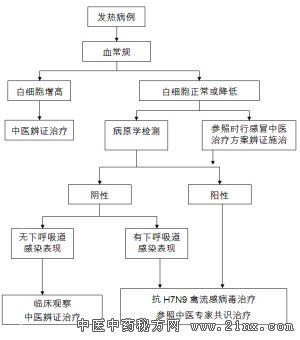 注:1.流程图中,专家共识为《人感染H7N9禽流感中医医疗救治专家共识(2014版)》。 2.对于血常规检查白细胞不高或者降低的病例,应当行甲型流感或H7N9禽流感病原学检测。具备PCR检测条件的,应行H7N9或H7核酸检测。不具备PCR检测条件的,可先行甲型流感病毒抗原检测。 3.早期患者检测的白细胞计数正常或降低,在病原学检测的同时,可参照时行感冒中医治疗方案辨证施治。