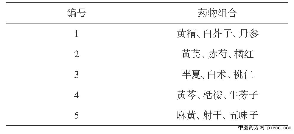 笔者以2003年3月至2015年8月期间于姜良铎教授门诊就诊的COPD稳定期患者为研究对象, 对姜良铎教授治疗COPD稳定期的常用药物进行关联规则分析, 探索其治疗COPD稳定期的常用药物组方规律。研究发现, 按照一定置信度与支持度的约束, 结合项数限制, 可演化出3味药组合, 即角药。结合姜教授临床经验, 对演化出的角药组合进行筛选, 选取合理的药物组合[2,3]。具体见表1。