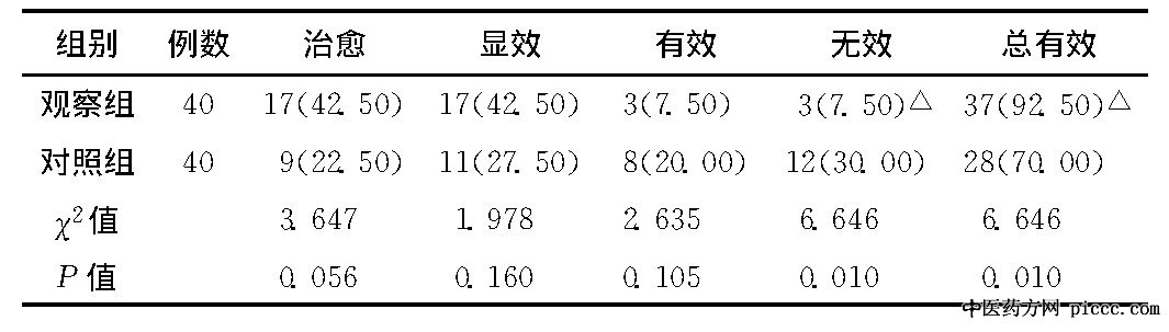 (1) 治疗效果比较观察组治疗总有效率为92.50%, 显著高于对照组的70.00% (P<0.05) 。见表1。