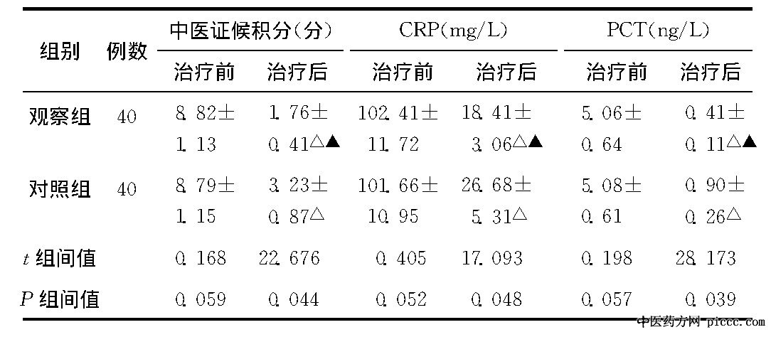 比较两组治疗效果及治疗前后中医证候积分、C反应蛋白 (CRP) 、血清降钙素原 (PCT) 水平。
