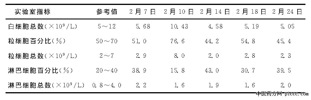 入院后给予我院自拟正阳汤煎服:黄芪10g,桑白皮10g,白术6g,炮姜4g,太子参10g,白芍6g,射干3g,甘草片3g,玄参6g,金银花6g。每日1剂,水煎至200mL,分2次温服。2月13日复查咽拭子核酸检测阳性,患儿无发热,舌脉象与入院时比较无明显改变。当日给予国家卫生健康委员会、国家中医药管理局推荐使用的清肺排毒汤加减治疗,在原方基础上去麻黄、桂枝、柴胡、枳实、细辛等辛温发散之品,按儿童常规用量给药。每日1剂,水煎至200 mL,分2次温服。2月16—26日多次送检咽拭子核酸检测仍为阳性。2月26日停用中药煎剂,予以广州市第八人民医院研制的透解祛瘟颗粒[4](组成:连翘30g,金银花15g,山慈菇20g,黄芩片10g,大青叶10g,柴胡5g,青蒿10g,蝉蜕10g,前胡5g,川贝母10g,浙贝母10g,茯苓30g,乌梅30g,玄参10g,黄芪45g,太子参15g)治疗,每次半包(冲服),每日2次。2月27—28日咽拭子核酸检测阳性。2月29日、3月1日及3月2日咽拭子核酸检测连续3次阴性。患儿血常规结果见表1。