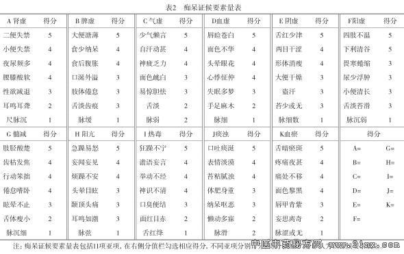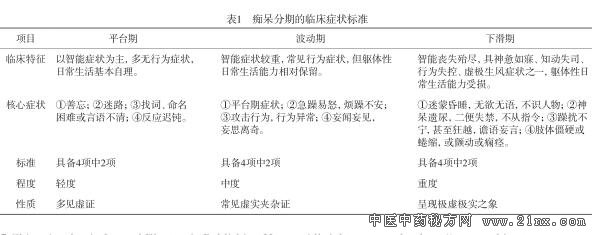 痴呆是一类以认知障碍为主要特征的临床病 症, 病因包括常见的阿尔茨海默病(Alzheimer’ s disease, AD)、血管性痴呆(vascular dementia, VaD) , 也包括相对少见的原因, 如帕金森病痴呆、 正常压力脑积水。 痴呆目前仍然是一类无法治愈的 疾病, 仅有少数短期改善症状的治疗药物。 《景岳全 书》始有 “痴呆” 病名, 并提出了治疗方剂七福饮和 大补元煎。 《辨证录》提出了洗心汤、 转呆丹等6则治 疗方剂。 然而, 中药治疗痴呆的疗效仍需经随机对照 试验验证。 临床试验纳入受试者除符合疾病诊断标 准外, 往往需要同时考虑疾病所处阶段(分期)和患 者的证型。 分期标准 痴呆的分期是基于疾病的病理生理学过程, 体制了疾病的进展阶段。 不同分期的患者存在症状、 证 候特征 [1] 及治疗需求的差异, 分期和辨证一样, 有助 于临床试验中纳入同质受试者。 阿尔茨海默病及血 管性痴呆占全部痴呆人群的80%, 分属中医老人呆 病及中风神呆 [2] 。 重度阶段二者的差异变得不明显, 均可出现二便失禁、 生活依赖、 形体消瘦、 肢体颤动 等。 典型AD痴呆以早期显著的记忆力下降为特征, 逐渐出现时间、 空间定向障碍, 容易迷路, 时间概念 缺乏, 但活动能力保留。 随病情加重, 除认知症状 外, 出现神经精神症状, 如打人毁物、 善恐易惊、 行 走困难、 肢体颤动或肢体僵硬。 症状的渐进进展反 应了胆碱能神经递质缺乏、 淀粉样蛋白沉积、 神经元 凋亡等一系列脑内病理性改变, 最终表现为脑实质 严重萎缩。 VaD存在不同类型, 而以皮质下动脉硬化 性脑病(Binswanger’ s disease)最常见, 且缓慢进展 的病程与AD具有相似性。 部分VaD可突然发病, 通常 是中风所致, 表现为 “一时而成呆病” [3] 或 “初起神 呆” [4] 。 通常以简易精神状态检查(mini-mental state examination, MMSE)评分将痴呆区分为轻度 (MMSE 21-26分) 、 中度 (MMSE 10-20分) 及重度 (MMSE<10 分 ) [5] 。 如上所述, 痴呆除认知症状外, 会伴有明显的神 经症状和精神症状, 痴呆分期不应只依据认知功能 (如 MMSE) 。 因此, 综合临床症状、 日常生活能力、 精神症 状及神经症状的严重程度分期可能更全面 (见表1 ) [2] 。 平台期、波动期和下滑期三分法最早源于 VaD,用于描述VaD认知症状的3种类型,即平 台样(plateau)、 波动样(fluctuating)和下滑样 (deterioration) [6] 。 笔者借用以描述痴呆分期: 平台期 为疾病初起, 病情稳定, 无明显症状波动, 持续时间 或长或短; 波动期与平台期相比病情明显不稳定, 呈 波动状态, 症状表现时好时坏, 较平台期加重, 常伴 有精神行为症状; 下滑期为症状急性或亚急性加重, 属疾病后期, 常合并病理征等神经症状。 分期辨证 证候是中医学概念, 是联接疾病与治疗的桥梁, 一方面帮助理解疾病的原因, 一方面帮助筛选中药。 张玉莲等 [7] 进行的多中心研究显示老年性痴呆人群 中肾虚为主要证候, 瘀血和痰浊是最常见的兼夹证 候, 认为肾虚为老年性痴呆发病的基础, 瘀、 痰为其 发展和加重的关键因素。 然而, 多数研究没有根据 认知损害的程度进行分层分析。 杨承芝等 [8] 以及王芗 斌等 [1] 的研究则依据程度分层分析, 认为轻度认知损 害阶段最主要的证候是肾虚。 除肾虚外, 陈淑慧等 [9] 的研究显示脾虚及血虚也是痴呆早期主要证候。 因 此, 痴呆平台期多见虚证。 波动期在虚证基础上, 实性证候更加突出, 主要 包括痰浊证、 血瘀证和火热证。 杨承芝等 [8] 的研究纳 入轻中度痴呆, 发现肾虚、 痰浊和血瘀是AD的主要 证候。 刘峘等 [10] 的研究以血管性痴呆为对象, 发现痴 呆患者肾虚、 痰浊及火热证候积分明显增加。 王芗 斌等 [1] 以血管性痴呆为对象, 发现中度阶段除肾虚、 痰浊证明显增加外, 瘀血阻络也随着病情加重而加 重。 因此, 波动期除平台期的肾虚证外, 痰浊、 血瘀 及火热表现更加突出。 下滑期实证更实, 虚证更虚。 吕素君等 [11] 的研究 纳入重度VaD病例, 除肾虚、 痰浊、 血瘀证表现更加 突出外, 肝阳上亢证也明显增加, 气血亏虚证随病情 加重也呈加重趋势。 田金洲 [2] 提出了痴呆终末期的毒 盛证候特点, 这一概念转引自王永炎 [12] 对中风病机的 毒邪假说, 认为毒邪是瘀、 痰、 火热等化生的产物, 又可称之为瘀毒、 热毒、 痰毒。 毒证患者表现为形体 消瘦、 脑消髓减, 出现迷蒙昏睡、 或躁扰不宁、 或二 便失禁、 或体痉肢颤。 辨证标准 ![]() 证候量表有助于提高辨证稳定性, 可对证候进 行量化分析。 痴呆证候量表应该对证候条目进行程 度量化, 考虑症状在证候中的权重 [13] 。 田金洲等 [14] 发表了我国最早的痴呆辨证量表, 并通过临床病例 调查, 纳入患者包括AD或VaD, 筛选出了11个相关 证候要素, 发表了 《痴呆证候要素量表》 (the pattern element scale for dementia, PES-D/11) , 目前为第2版 (见表2)。 每个证候要素包括7个评分条目, 总分 为23分, 得分大于7分则该证候诊断成立。 与专家辨 证比较, 敏感性为58.1%-94.7%, 特异性为71.2%- 97.3% [15] 。 临床试验中为提高辨证稳定性, 建议采用 量表进行证候评价。 ![]() 分期辨证在临床试验中的应用 痴呆临床试验受试者筛选应遵循病证结合, 分 期与辨证结合的原则。 分期的选择应结合主要疗效 指标, 主要疗效指标为认知功能时建议选择平台期 及波动期, 主要疗效指标为精神行为症状时应选择 波动期及下滑期。 纳入标准应明