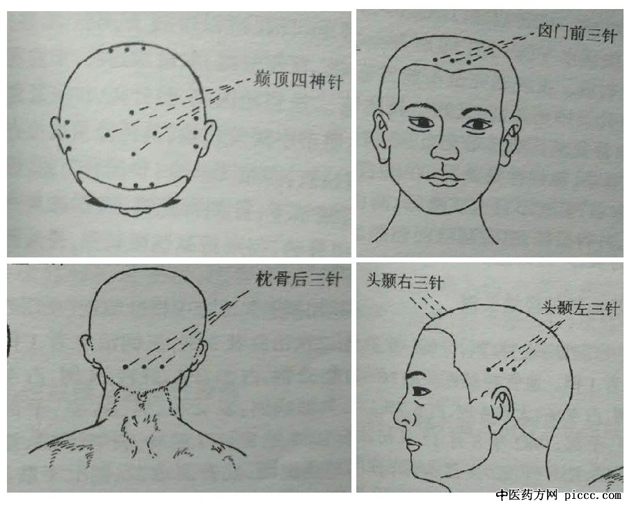 管遵惠教授经过多年治疗慢性脑供血不足的经验, 总结出以头部穴位为主的“益脑十六穴”, 其组成:囟门前三针, 枕骨后三针, 头颞左三针, 头颞右三针, 巅顶四神针。“囟门前三针”:前发际上1寸, 水平旁开1.5寸, 计三穴, 向下平刺0.5~0.8寸。“枕骨后三针”:后发际上2寸, 脑户穴下0.5寸, 水平旁开1.5寸, 计三穴, 向下平刺0.5~0.8寸。头颞左三针:头左侧, 角孙上2寸, 水平旁开1.5寸, 计三穴, 向下平刺0.5~0.8寸。头颞右三针, 头右侧, 角孙上2寸, 水平旁开1.5寸, 计三穴, 向下平刺0.5~0.8寸。巅顶四神针:百会前后左右各1.5寸, 计四穴, 向百会方向平刺0.5~0.8寸。见图1。