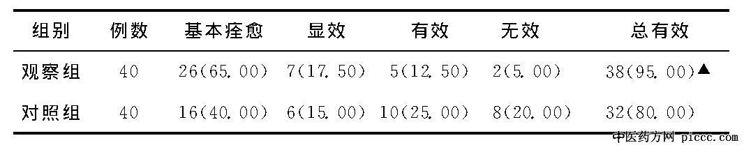 (1)临床疗效比较观察组治疗总有效率为95.00%(38/40),高于对照组的80.00%(32/40),差异有统计学意义(P<0.05)。见表1。