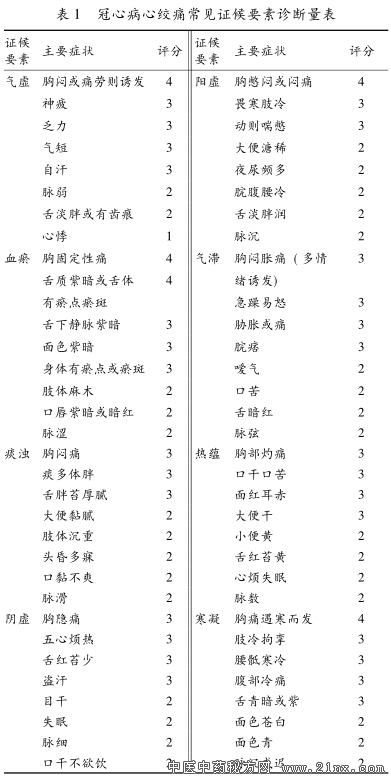 证候要素是中医对疾病病因病机的表述 [1 ] , 是中医证候诊断的最小诊断单元。它与疾病的生理 病理相关联,并由可测量的一组临床信息直接表 达,具有病理学与诊断学的双重概念 [2 ] 。证候要 素的提取,降维升阶的辨证方法新体系的建立,是 对以往辨证体系的有益补充。因此,将复杂的证候 分解为概念相对清晰、数量相对局限的证候要素及 应证组合,从而促进中医证候的规范化与标准化研 究,进而提高中医药治疗冠心病心绞痛的临床疗 效,对中医的规范化、标准化工作有重要促进作 用,同时可以提高中医药治疗冠心病的临床疗效。 受中华中医药学会心血管病分会委托,按照诊 断量表制作的国际规则,本标准采用文献分析、专 家咨询、临床流行病学调查等方法,基于全国 5 个 中心 1069 例冠心病心绞痛病例,运用自组织竞争 神经网络、复杂系统熵聚堆、复杂系统熵的关联 度、聚类分析、因子分析、多元对应分析、判别分 析、多元线性回归分析,并结合专家经验,初步建 立了冠心病心绞痛证候要素诊断标准 [3 -11 ] 。其后, 通过对 1000 例冠心病心绞痛患者进行证候要素的 诊断,计算受试者工作特征曲线 ( ROC) 下的面 积为 0. 91,并应用于临床反复检验,具有良好的 信度和效度。本标准被纳入国家中医药管理局临床 重点专科建设内容,并作为 “冠心病病证结合证 治体系的建立及应用”的部分内容获 2013 年国家 科学技术进步二等奖,成果已推广应用到国家 “十一五”科技支撑计划、国家重大新药创制项 目、国家自然基金项目等多项国家级科研课题研究 及多家医院的临床工作中,可为临床医生提供更为 实用的冠心病心绞痛证候诊断标准,以提高临床诊 疗水平。 冠心病心绞痛常见证候要素诊断量表及评 分方法见表 1。 ![]() 注: 评分方法: 1) 单一证候要素得分相加≥8 分即可诊断; 2) 各个证候要素得分 8 ~12 分为轻度; 13 ~ 16 分为中度; 17 ~ 23 分为重度; 3) 证候要素之间可进行组合,如同时符合证候要素气 虚、血瘀的诊断即可诊断为气虚血瘀证 来源:中医杂志 作者: 王阶 邢雁伟 |