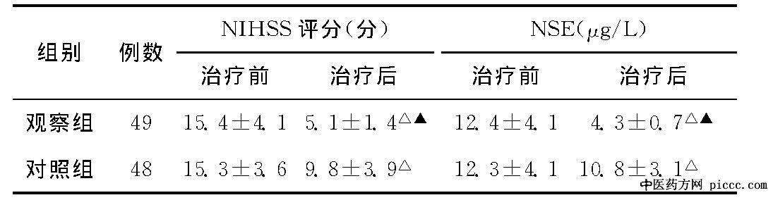 ¹Û²ì×éNIHSSÆÀ·Ö¡¢NSEˮƽ¾ùµÍÓÚ¶ÔÕÕ×é (P<0.05) ¡£¼û±í2¡£