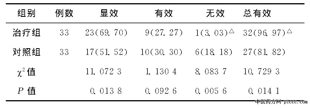 (1) 临床疗效比较对照组总有效率明显较治疗组低, 差异具有统计学意义 (P<0.05) 。见表1。