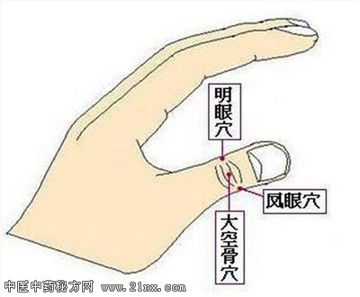 在大拇指上有三个相邻接的穴道,分别是明眼、凤眼、大空骨(如上图)。明眼、凤眼能够改善眼睛疲劳和急性结膜炎,大空骨则可改善一切有关眼睛的症状。平时眼睛容易疲劳的人,每天要刺激这三个穴道两次。