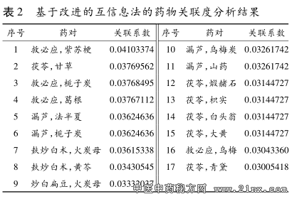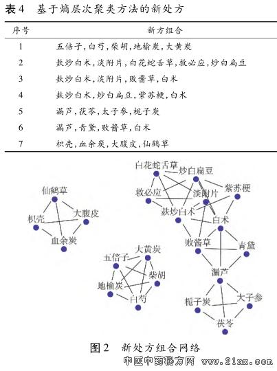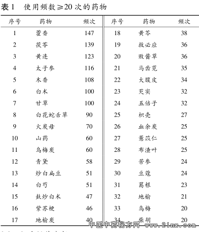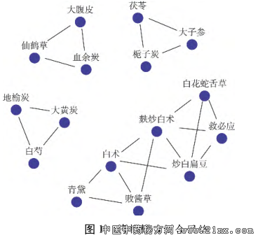 基于中医传承辅助系统的刘凤斌治疗溃疡性结肠炎用药规律分析 溃疡性结肠炎是一种发病机制尚不十分清楚的慢性 非特异性炎症, 其病变部位主要在结肠黏膜层和黏膜下 层, 呈连续性弥漫性分布, 通常先累及直肠, 逐渐向全结 肠蔓延, 甚至累及末端回肠 [1 ] 。刘凤斌教授师承国医大 师邓铁涛教授, 为广东省名中医, 国家人力资源和社会保 障部 “百千万人才工程” 国家级人选和“国家有突出贡献 中青年专家” , 全国百名杰出青年中医, 从医30 余载, 精于 脾胃系疾病的辨证施治, 尤其对溃疡性结肠炎的治疗积 累了丰富的临床经验, 疗效显著。本研究采用中医传承 辅助系统, 对刘凤斌教授治疗溃疡性结肠炎的组方特点 和用药规律进行挖掘, 进而为传承其学术经验提供参考。 1 资料与方法 1.1 资料选择 ①根据 《炎症性肠病诊断与治疗的共识意 见(2012 年·广州)》 [2 ] 中的有关标准, 患者明确诊断为溃 疡性结肠炎。②以中药汤剂为主要治疗方法。③病历资料 完整(包含患者个人信息、 四诊信息及中药处方信息等)。 ④就诊次数≥6 次者, 选取 3 首处方(包括首诊处方);就诊 次数<6 次者, 选取 2 首处方(包括首诊处方)。排除心、 肺、 肾等重要脏器有严重原发疾病者。 1.2 资料来源 2013 年 1 月 1 日至 2016 年 6 月 1 日期 间, 广州中医药大学第一附属医院脾胃病科刘凤斌教授 门诊诊治的溃疡性结肠炎患者的临床资料。 1.3 研究方法 1.3.1 中药名称的规范 根据《中华人民共和国药 典》 [3 ] , 对处方中的中药名称进行规范、 统一, 如“广藿香” 统一为 “藿香 ” , “关黄柏炭” 统一为“黄柏炭” , “粉葛” 统 一为 “葛根” 。但对于炮制方法不同的同一种药物, 仍保 留包含炮制法的药物名称, 如“白术” 和“麸炒白术” , “甘 草” 和 “炙甘草” , “乌梅” 和“乌梅炭” , “地榆” 和“地榆 炭” 等。 1.3.2 数据提取 将筛选处方中的所有组成药物录入中 医传承辅助系统。考虑数据录入过程中存在一定的纰 漏, 故在数据录入结束后, 由两人再次核对所录数据, 以 确保准确无误, 进而为数据挖掘及分析提供可靠的保障。 1.3.3 数据分析 (1)频次统计。通过中医传承辅助系统中的“方剂分 析” 功能, 进行用药频次统计分析, 将处方中每味药物的出现 频次从高到低进行排序, 并将结果导入 Excel 文件中。 (2)组方规律分析。运用中医传承辅助系统中的“组 方规律” 功能, 参照有关文献 [4 ] , 设置支持度及置信度, 分 析各药物之间的关联规则。 (3)新方分析。参照有关文献 [4 ] 设置相关度和惩罚 度, 并采用复杂系统熵聚类的核心组合分析法, 挖掘用药 规律, 演化核心组合药物, 并在核心组合药物的基础上通 过层次熵聚类方法归纳出新的处方。 2 结果 2.1 一般情况 本研究共纳入病例 71 例, 其中男性 38 例, 女性 33 例;年龄 16~70 岁, 平均 38.1 岁。共纳入处方 169 首, 涉及药物 126 种, 累计使用频次 2 248 次。 2.2 药物频次分布的基础分析 对刘凤斌教授治疗溃疡 性结肠炎所用的 126 种药物进行频次统计, 使用频次在 20 次以上的药物共 34 种, 其中使用频次最高的 12 味药 物分别为藿香、 茯苓、 黄连、 太子参、 木香、 白术、 甘草、 白花 蛇舌草、 火炭母、 山药、 乌梅炭、 青黛, 用药频次均≥58 次, 为高频使用药物。见表 1。 ![]() 2.3 组方规律分析 2.3.1 基于改进的互信息法的药物关联度分析 依据方 剂数量, 设置相关度(药物与药物之间的关联度)为 8, 惩 罚度(减少负面数据信息干扰的参数)为 2, 进行聚类分 析, 得到方剂中两两药物间的关联度, 其中关联系数在 0.03 以上的药对有 17 个。见表 2。 表 2 基于改进的互信息法的药物关联度分析结果 ![]() 2.3.2 基于复杂系统熵聚类的药物核心组合分析 基于 复杂系统熵聚类方法, 按相关度为 8 和惩罚度为 2 的约 束条件, 演化出 3~4 味药物的核心组合 14 个。见表 3、 图 1。 ![]() 2.3.3 基于无监督熵层次聚类的新处方分析 在以上药 物核心组合分析的基础上, 点击“提取组合” , 通过无监督 的熵层次聚类方法, 进一步组合、 演化出 7 首新处方。见 表 4、 图 2。 表 4 基于熵层次聚类方法的新处方 ![]() 3 讨论 溃疡性结肠炎临床主要表现为腹泻、 腹痛、 黏液脓血 便、 里急后重, 具有易于反复、 迁延难愈的特点, 属中医学 “久痢” 范畴 [5 ] 。本病病因病机复杂, 治疗颇为棘手, 是临 床难治性消化道疾病之一。 刘教授深谙国医大师邓铁涛教授五脏相关理论, 认为 该病病位在脾与大肠, 与五脏相关, 尤与肝、 肾二脏关系密 切。本病的发病以脾虚为本, 湿热为标 。《景岳全书·泄 泻》 云 :“泄泻之本, 无不由于脾胃……若饮食失节, 起居 不时, 以致脾胃受伤, 则水反为湿, 谷反为滞……而泻痢作 矣。 ” 脾胃居中焦, 主运化水谷, 性喜燥恶湿, 易为感寒受 湿、 饮食不节、 忧思劳虑所伤。脾脏既弱, 则运化之职失 权, 水聚为湿, 谷停为滞, 壅塞不通, 郁而化热, 而致湿热搏 结, 迫于大肠, 发为痢疾。然土虚则木易乘之, 诚如《医方 考》 所云 :“泻责之脾, 痛责之肝;肝责之实, 脾责之虚, 脾 虚肝实, 故令痛泻。 ” 溃疡性结肠炎患者往往腹痛、 腹泻相 伴而发, 提示其发病与肝脏关系甚为密切, 且临床中可见 部分患者发病或病情反复与情绪紧张、 焦虑、 抑郁等密切 相关, 亦证实肝脾不调是其重要的发病机理。有研