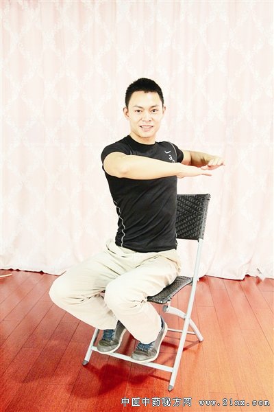 1 端坐转体拉伸健腰肾 方法:端坐在椅子上,双腿自然并拢,双手放在胸前呈扩胸状,保持下半身不动,向右扭转身体,保持10秒后放松,休息片刻后向反方向重复扭转动作,左右扭转20次。 效果:转体拉伸不但能强化腰肌力量,提高腰椎的柔韧性,长期坚持还能达到强肾、健肾的养生效果。 动作 2
