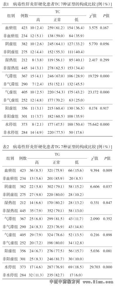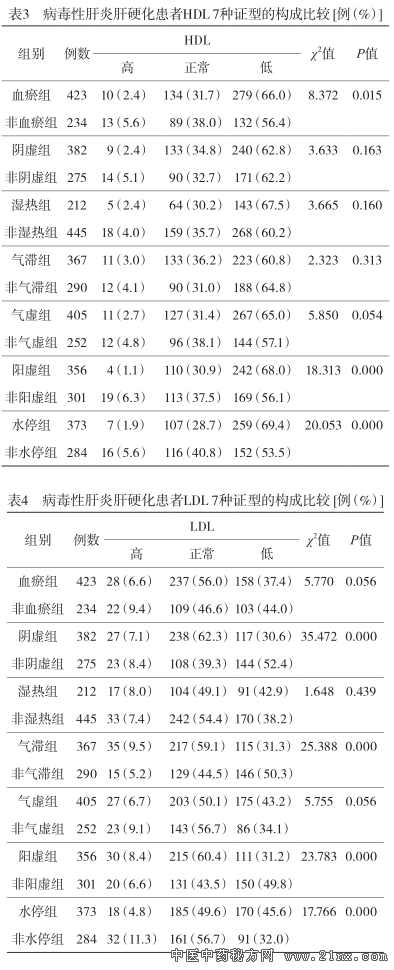 病毒性肝炎肝硬化是由肝炎病毒长期作用于肝脏引起的 一种慢性、进行性、 弥漫性肝病, 随病情发展, 不同程度的影 响肝脏的正常生理功能 [1] 。 肝脏作为人体脂质代谢的中心, 在内 源性和外源性脂质代谢中均发挥着重要作用 [2] 。 故病毒性肝炎 肝硬化的发生发展所导致的肝脏生理功能受损, 可能影响人体 脂质的正常代谢。 本病的中医证候类型纷繁复杂, 通过《肝炎 肝硬化常见证候要素辨识标准》的制定, 总结出血瘀、 阴虚、 湿 热、 气滞、 气虚、 阳虚、 水停7种病性类证候要素 [3] , 有利于简化 中医证候与客观指标相关性的探讨。 本研究利用前期收集的病 毒性肝炎肝硬化患者中医临床信息及血脂检查结果, 探讨血脂 水平与病性类证候要素的关系。 资料 1. 研究对象 657例病例均来源于2011年9月至2012年12月 期间中国人民解放军第302医院、 湖北省中医院、 首都医科大学 附属北京地坛医院、 首都医科大学附属北京佑安医院、 北京中 医药大学东方医院、 中国中医科学院西苑医院、 首都医科大学 附属北京中医医院及广西中医药大学第一附属医院的门诊或 住院患者。 其中乙型肝炎肝硬化患者568例, 丙型肝炎肝硬化 患者86例, 乙型、 丙型肝炎病毒均感染的肝硬化患者3例; 男性 464例, 女性193例, 患者平均年龄(49.97±9.18) 岁。 2. 病例选择标准 2.1 肝炎肝硬化诊断标准 参照2000年9月中华医学会传 染病与寄生虫分会、 肝病学分会联合修订的《病毒性肝炎防治 方案》 [4] 以及2010年中华医学会肝病学分会、 中华医学会感染 病学分会联合修订的《慢性乙型肝炎防治指南》 [5] 。 2.2 血脂水平诊断标准 由各医院提供收治患者的血 脂检查结果, 将患者按各院提供的胆固醇(total cholesterol, TC) 、 甘油三酯(triglyceride, TG) 、 高密度脂蛋白 (high density lipoprotein, HDL)、 低密度是蛋白(low density lipoprotein, LDL)参考值范围, 分为高、 正常、 低。 2.3 纳入标准 ①符合病毒性肝炎肝硬化诊断标准; ②年 龄在18-65岁之间。 2.4 排除标准 ①未签署知情同意书; ②并发有原发性肝 癌的患者; ③并发有其他系统严重感染的患者; ④合并有明确 的非肝炎肝硬化相关的五官、 心脑血管、 呼吸系统、 泌尿系统、 内分泌和造血系统严重原发性疾病患者; ⑤应用特殊治疗, 如 干扰素等治疗后出现明显不良反应的患者; ⑥曾行脾切除术或 经颈静脉肝内门腔分流术的患者; ⑧非肝炎肝硬化相关精神异 常患者; ⑨妊娠哺乳期妇女; ⑩并发有代谢综合征的患者。 ![]() ![]() 方法 1. 临床信息 收集运用课题组统一制定的《肝炎肝硬化临 床信息采集表》 , 收集患者的临床信息, 采集血液标本并统一 检测血脂指标, 包括TC、 TG、 HDL、 LDL。 2. 病性辨证类型的判定 参照1995年国家中医药管理局 颁布的《中医病证诊断疗效标准》 《中医证候鉴别诊断学》和 2002年《中药新药临床研究指导原则》以及课题组前期文献回 顾结果, 拟定 《肝炎肝硬化常见证候要素辨识标准》 , 根据该标 准, 对所调查的病毒性肝炎肝硬化患者的病性辨证类型进行 判定。 3. 数据库建立及统计学方法 数据录入采用本课题组统 一管理平台建立数据库, 由两人独立录入数据并进行二次核 对。 采用SPSS 20.0软件包对数据进行统计学分析, 计数资料采 用例数和百分比(%)的形式表示, 组间比较采用卡方检验。 所 有检测结果均以P<0.05为差异有统计学意义。 结果 1. 病毒性肝炎肝硬化患者不同TC水平病性辨证结果的分 布情况 见表1。 其中, 气滞、 气虚、 水停3种证型不同TC水平间 分布频率的差异有统计学意义 (P<0.01) 。 2. 病毒性肝炎肝硬化患者不同TG水平病性辨证结果的分 布情况 见表2。 其中, 血瘀、 阴虚、 水停3种证型不同TG水平 间分布频率的差异有统计学意义 (P<0.05, P<0.01) 。 3. 病毒性肝炎肝硬化患者不同HDL水平病性辨证结果的分布情况 见表3。 其中, 血瘀、 阳虚、 水停3种证型不同HDL水平 间分布频率的差异有统计学意义 (P<0.05, P<0.01) 。 4. 病毒性肝炎肝硬化患者不同LDL水平病性辨证结果的 分布情况 见表4。 阴虚、 气滞、 阳虚、 水停4种证型不同LDL水 平间分布频率的差异有统计学意义 (P<0.01) 。 讨论 病毒性肝炎肝硬化是常见肝脏疾病之一, 患者的肝脏生理 功能常受到不同程度的损伤, 从而影响肝脏参与人体正常的血 脂代谢 [6] 。 中医学一般将本病归属于臌胀、 积聚、 黄疸等范畴, 其发生主要是由于肝脏正气亏虚, 湿热疫毒乘虚侵袭, 久羁人 体, 导致脏腑功能失调, 气血失和 [7-8] 。 疾病过程中可出现多种 证型变化 [9] , 不同证型的血脂水平可能存在差异。 故本文以中 医藏象学说为基础, 研究病毒性肝炎肝硬化患者血脂水平与病 性类证候要素的关系, 对从中医角度探讨脏腑功能失调与客观 指标之间的关系有一定的参考价值。 中医藏象学说认为, 肝脏的主要生理功能是主藏血和主 疏泄。 肝藏血是指肝具有贮藏血液、 防止出血和调节血量的作 用; 肝主疏泄, 具有疏通、 舒畅、 条达的生理功能, 调畅气机, 维持人体 “气化” 的正常发生 [10] 。 病毒性肝炎肝硬化的病位在 肝, 多种原因(如过劳、肝郁等)导致的肝藏血主疏泄生理功 能失调是发病的内在基础, 湿热疫毒(肝炎病毒)乘虚入侵人 体是外在发病条件 [11-12] , “正邪相争” 是基本病理变化过程 [13] 。 当正气与病邪相持日久, 邪实难去, 又