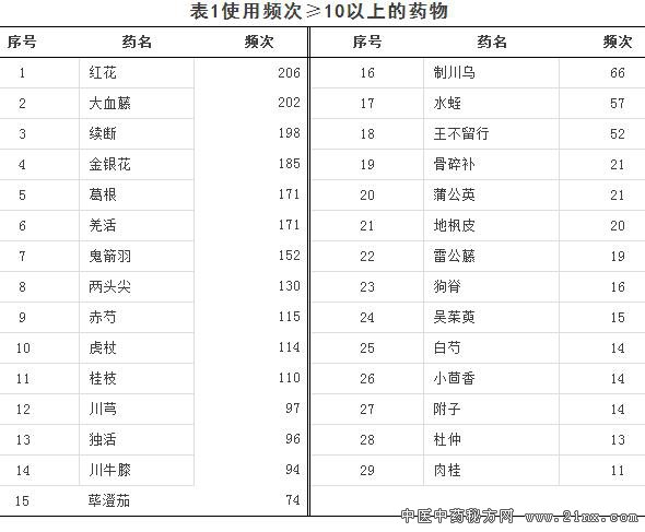 1.1来源 以2014年1月~2015年7月于山东省中医院门诊张鸣鹤教授接诊的患者处方为研究来源,筛选出强直性脊柱炎患者(参照ACR1984年修订的纽约标准)的完整有效处方共207首。