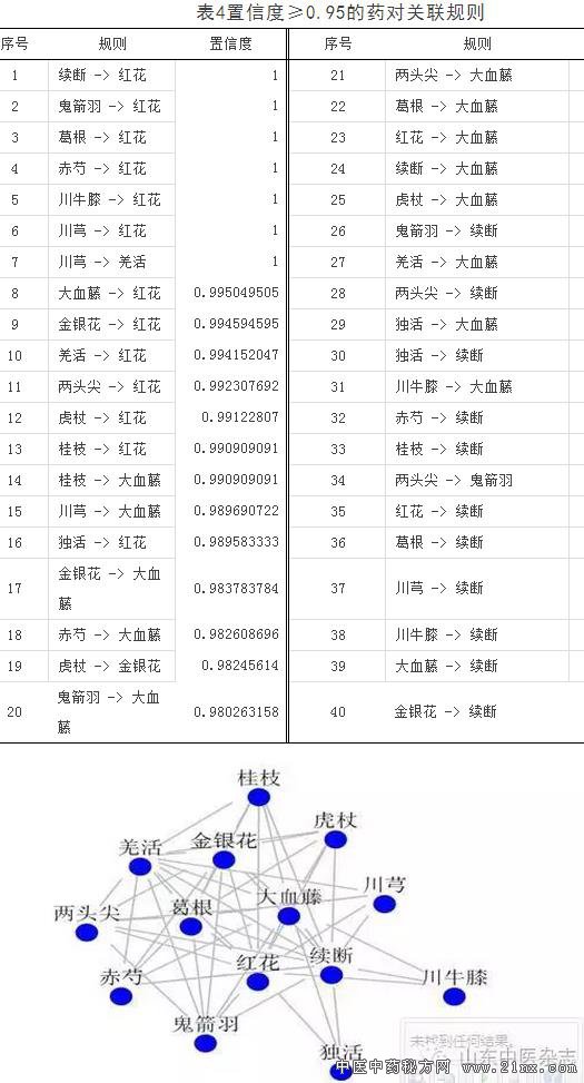 2.2 基于关联规则的组方规律分析 在“组方规律”中设置“支持度个数”为90,“置信度”为0.95,对药物组合频数及关联进行分析,并分别统计后列表(见表3,4),其中共包含14种药物,主要有红花、金银花、大血藤、续断、葛根、虎杖、鬼箭羽。数据呈现明显集中趋势,可见组方核心较为稳定。