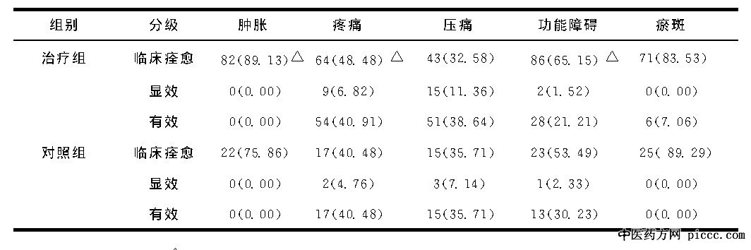 (1) 中医证候疗效判定标准痊愈:肿胀、疼痛、瘀斑等症状、体征积分减少≥95%, 关节活动正常;显效:肿胀、疼痛、瘀斑等症状、体征积分减少≥70%但<95%, 关节活动不受限;有效:肿胀、疼痛、瘀斑等症状、体征积分减少≥30%但<70%, 关节活动改善;无效:肿胀、疼痛、瘀斑等症状、体征积分减少不足30%, 关节活动无变化。中医证候总有效率= (治疗前总积分-治疗后总积分) /治疗前总积分×100%。愈显率= (临床痊愈+显效) /总例数×100%。非愈显率= (有效+无效) /总例数×100%。