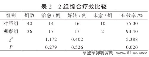 广东省湛江中心人民医院 钟邱,林凯,苏小霖,吴养 摘要 目的:探讨四妙散加味联合针灸推拿治疗膝关节骨性关节炎临床疗效。方法:将 76 例确诊为膝关节骨性关节 炎且中医证型属于湿热痹阻的患者纳入研究并随机分组,对照组 40 例予塞来昔布治疗,观察组 36 例则采用四妙散 加味联合针灸推拿治疗,1 个月为 1 个疗程。比较 2 组患者临床综合疗效及关节疼痛、晨僵及功能活动(WOMAC 积 分)改善情况;观察不良反应情况。结果:2 组患者症状均缓解,但各指标改善方面观察组均更显著,差异具统计学意 义;对照组 3 例出现胃肠不适,观察组则无不良反应。结论:四妙散加味联合针灸推拿治疗膝关节骨性关节炎疗效显 著,较塞来昔布而言,患者临床症状、关节症状及功能的改善情况均更显著,值得推广。 关键词 四妙散加味;针灸推拿;膝关节骨性关节炎;临床观察 膝关节骨性关节炎(KOA)又称为退行性关节 病,是临床常见的骨关节疾病,以关节疼痛、肿胀为主 要临床表现。本病多见于中老年女性,我国发病率为 50% ~ 80%,随年龄升高,发病率成逐渐升高趋势,严 重影响患者生活质量 [1] 。KOA 治疗药物较多,对乙酰 氨基酚、COX-2 抑制剂、糖皮质激素等抗炎镇痛药物 的应用可改善大多患者的临床症状,但部分患者常因 难以耐受各类副作用而影响治疗。如何提高本病的 临床疗效并且不增加不良反应已成为研究的热点及 难点,我们应用四妙散加味联合针灸推拿治疗 KOA, 疗效显著,现报道如下。 资料与方法 1 诊断标准 参照《中医病症诊断疗效标准》 [2] 。 2 纳入标准 ①符合诊断标准,并且已知情同意者;②中医证 型属湿热痹阻;③受试者自身无严重疾病;④年龄 38 ~ 70 岁;⑤所有患者均经我院医学伦理会审核通 过。 3 排除标准 ①女性患者尚处在哺乳期或妊娠期,不便纳入者; ②中医证型不符;③肝肾功能严重损伤;④精神病不 能配合治疗;⑤受试药物过敏;⑥存在类风湿性关节 炎等其他能引起关节疼痛的疾病者。 4 一般资料 病例均为我院 2014 年 7 月—2015 年 6 月确诊为 KOA 且中医证型属于湿热痹阻患者 76 例,采用随机 数据表法进行分组,观察组 36 例,男 15 例,女 21 例; 年龄(42.74±8.39)岁;病程(22.14±8.37)月;X 线诊 断分期(参照《骨关节炎诊治指南》):I 期 3 例,Ⅱ期 12 例,Ⅲ期 19 例,Ⅳ期 2 例。对照组 40 例,男 16 例, 女 24 例;年龄(41.86±8.07)岁;病程(21.36±8.48) 月;X 线诊断分期:I 期 4 例,Ⅱ期 14 例,Ⅲ期 19 例, Ⅳ期 3 例。2 组年龄、性别、病程、分期等资料均无统 计学差异,具可比性。 5 治疗方法 5.1 对 照 组 塞 来 昔 布(辉 瑞 制 药,批 准 文 号 J20030098),200mg/ 次,2 次 /d。 5.2 观察组 采用针灸推拿联合四妙散加味治疗。 5.2.1 针刺治疗 均用 0.25mm×40mm 华佗牌一次 性针灸针进行操作,进针前嘱患者平卧,安抚并消除 其紧张及顾虑,以免发生晕针。针灸时选取阳陵泉、阴 陵泉、内犊鼻、外犊鼻、梁丘、血海、足三里、太溪等穴 位。垂直进针,施予平补平泻法,得气后留针 30min。 5.2.2 推拿治疗 嘱患者仰卧,通过揉法和滚法使膝 关节周围肌肉放松;点按足三里、内犊鼻、阳陵泉、外 犊鼻、委中;以拇指患者对患者髌骨上下缘进行轻揉 3 ~ 5 次;以五指对患者髌骨向上提捏,次数以 3 ~ 5 次为宜;握住踝部,依据患者关节活动度顺时针和逆 时针交替运动 3 ~ 5 次;最后再以揉法和滚法使关节 周围肌肉方式。推拿时间 0.5h 为宜,2 次 / 周。 5.2.3 中药汤剂 方选用自拟四妙散加味,由川牛 膝、苡米、防己、连翘、木瓜各 10g,苦参、秦艽、苍术、生 地、赤芍各 10g,黄柏 5g,忍冬藤15g,并随症加减,药 物均由我院中药房统一代煎,150mL/ 次,2 次 /d,所有 治疗手段均以 1 个月为疗程。 6 观察指标 观察 2 组患者关节疼痛、晨僵及功能活动的改善 情况。采用 WOMAC [5] 指数评分方法,将患者关节疼 痛、晨僵及功能活动的程度从无、轻、中、严重到非常 严重分别以 0 ~ 4 分表示。其中关于疼痛的项目共 5 项,总分 20 分;关于僵硬 2 项,总分 8 分;关于关节功 能活动 17 项,总分 68 分。观察 2 组临床综合疗效及 不良反应差异。 7 统计学方法 采用 SPSS13.0 软件,均采用双侧检验,统计前对 数据进行正态分布检测,计量资料用(x _ ±s)表示,比 较用 t 检验,率用卡方检验;P<0.05:差异有统计学意 义。 疗效观察 1 疗效指标 参考《中医病证诊断疗效标准》疗效标准,治愈: 无关节疼痛及肿胀,活动功能正常;好转:关节疼痛、 肿胀减轻,活动功能好转;未愈:关节疼痛及肿胀无变 化。 2 结果 2.1 WOMAC 积分比较 经治疗后,2 组患者症状均 比治疗前缓解(P<0.05);各指标改善方面观察组均更 显著(P<0.05),见表 1。 ![]() 2.2 综合疗效比较 对照组 3 例出现胃肠不适,观察 组则无,组间比较不良反应发生率相仿;2 组治愈及好 转例数组间单独比较无显著差异,P>0.05;观察组有 效率更高,差异显著,P<0.05,见表 2。 ![]() 讨 论 KOA 是一种由于人体机能衰退而导致的退行性 疾病,中老年人多见,严重影响患者的生活质量。本 病病变部位并非局限于软骨,而是牵涉至整个关节。 KOA 的病因还未被完全阐明,多数学者认为长期超 负荷负重及关节退化是重要的的发病基础。治疗上 本病尚缺乏特效药物,发病初期可采用非药物治疗, 通过减轻体重、适当的有氧运动等缓解疼痛,如仍未 缓解或反而加重,则需考虑药物治疗 [3] 。非甾体消炎 药有一定疗效,但由于药物副作用较大,应谨慎使用。 我