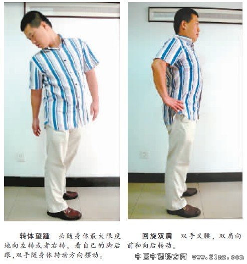 回旋双肩:双手叉腰,双肩向前和向后转动.