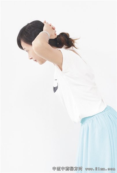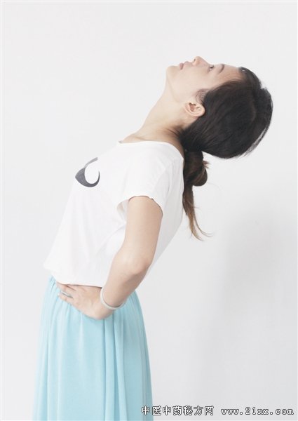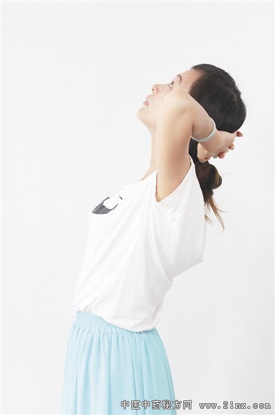 2.将头向后弯至感到拉紧,持续15秒。 ![]() 第三步: 拉背后压,松弛背部 1.双手交叉,拇指轻压背部下方;
