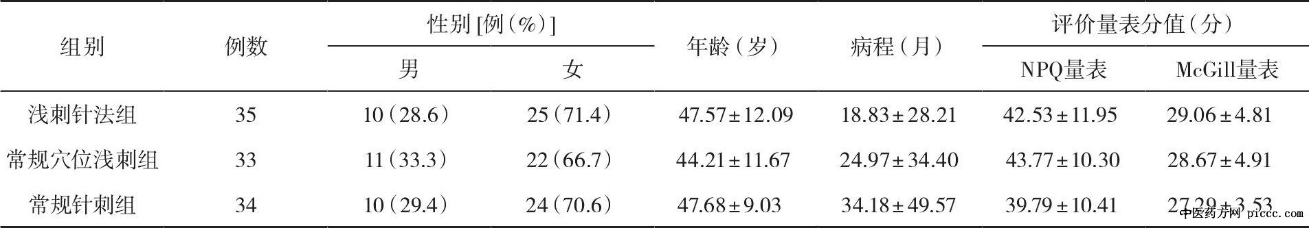 1.一般资料本研究105例病例均来源于2014年12月至2015年12月广东省中医院针灸科住院部及门诊收治的颈椎病颈痛患者。运用SPSS软件产生随机数, 采用随机信封法, 将105例受试者随机分为3个组:浅刺针法组和常规穴位浅刺组、常规针刺组。纳入后3组患者的性别、年龄、病程和治疗前量表积分等一般资料比较, 差异均无统计学意义, 具有可比性, 详见表1。