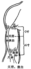 [出处]《灵枢·本输》:“腋内动脉,手太阴也,名曰天府。” [穴名解]天,人体的上部;府,聚也。本穴属肺经位于上臀,为肺气聚集之所,故名天府。 [功用]调理肺气,安神定志。 [主治] 1.呼吸系统疾病:支气管炎,哮喘; 2.精神神经系统疾病精神病,煤气中毒; 3.其它:鼻出血,吐血,肩臂部疼痛。 [刺灸法] 剌法:直刺0.3~0.5寸,局部酸胀,可向臂部或肘部放散。 灸法:温针灸3~5壮,艾条灸5~10分钟。 [配穴举例]配会穴,治疗瘿瘤;配合谷穴,治疗流鼻血。 [现代研究]临床用于呼吸系统疾病,上臂疼痛的治疗。 |