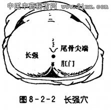 [出处]《灵枢·本输》:“督脉之别,名曰长强,挟膂上项,散头上,下当肩胛左右,别走太阳入贯膂。” [别名]气之阴郄,龟尾,尾翠,穷骨,橛骨。 [穴名解]身长之骨,莫长于脊骨,故曰长,而此穴正当其下之最锐处,故曰强。 [位置]在尾骨端下,当尾骨端与肛门连线的中点处。(图8-2-1)