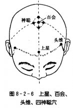 [解剖]皮肤→皮下脂肪→帽状腱膜→腱膜下疏松组织。布有枕大神经、额神经的分支和左、右颞浅动、静脉及枕动、静脉的吻合网。 [取法]正坐位或仰卧位。在头部,当后发际正中直上5寸,或两耳尖连线的中点处取穴。 [简易取法]正坐位或仰卧位。①在头部,两耳尖连线与头正中线相交处取穴。②在头顶部正中凹陷处取穴。(图8-2-6) ![]() [功用]升阳固脱,开窍宁神。 [主治]眩晕,健忘,头痛,头胀,脱肛,角弓反张,阴挺,癫狂,痫证,癔病,小儿急慢惊风,夜啼等 [刺灸法]直刺0.1-0.3寸,或斜刺0.5—0.8寸;可灸。 [配穴举例]百会配脑空、天柱,主治头风,眼花;百会配脾俞,主治久泻滑脱下陷。 [现代研究]近年来有报道针刺百会穴能够扩张血管,增加脑部血流量,改善脑部的血液循环。 |