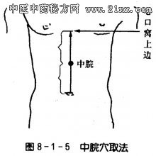 [出处]《难经》:“四十五难曰:经言八会者,何也?然府会太仓。丁曰:府会太仓者,胃也。其穴者,中脘是也。” [别名]胃脘,太仓,大仓,胃管,三管,上纪,中管,中腕。 [穴名解]上纪者,中脘也,胃之募也。 [位置]在上腹部,前正中线上,当脐中上4寸。(图8-1-2)