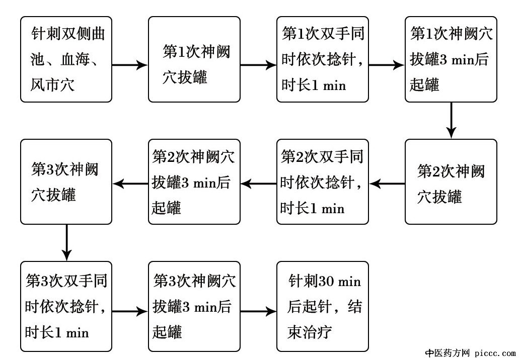 “三三三疗法”针对的疾病就是荨麻疹,操作比较简单。因为在操作过程中多次涉及“3”这个数字,比如针刺曲池、血海、风市3个穴位;穴位捻针3次,每次1min,共计3min;每次神阙穴拔罐3min,连续拔罐3次,所以钮韵铎教授形象地将这种治疗方法命名为“三三三疗法”。在临床治疗中,不论急性荨麻疹或慢性荨麻疹,钮韵铎教授基本都会使用“三三三疗法”。该疗法隔日1次,3次为1个疗程。具体操作顺序如下图。
