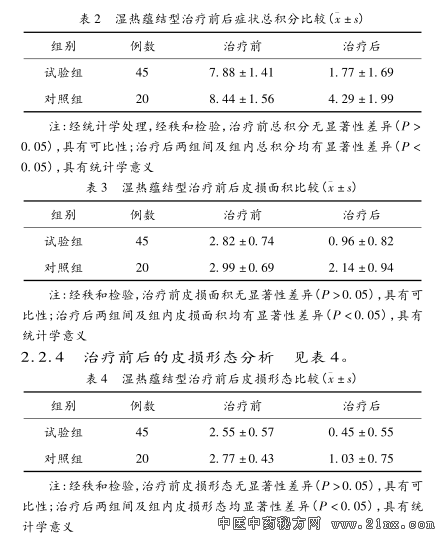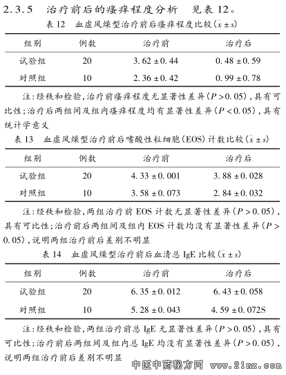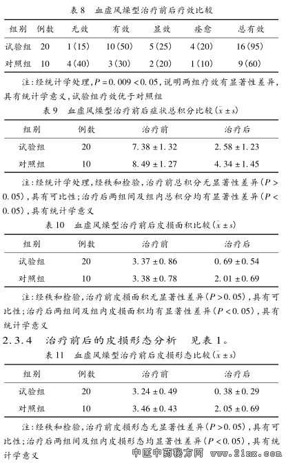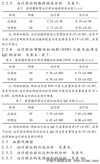 湿疹是一种常见的变态反应性疾病, 皮疹呈多样 性, 易反复发作 [1 ] 。临床上西医治疗多给予抗组胺药, 糖皮质激素等治疗, 在短时间内效果显著, 但患者病情 恢复不稳定, 易复发。中医对湿疹的病因病机见解颇 丰, 运用辨证施治针对不同证型的患者分别给予不同 的汤剂、 中药外洗、 外涂等方法, 疗效显著。现取 95 例 湿疹患者, 进行临床研究, 报道如下。 1 资料与方法 1. 1 临床资料 入选病例均来自于2014 年2 月—2014 年11 月期 间就诊于本溪市中医院皮肤科门诊的湿疹患者, 符合 纳入标准的受试者共 95 例。 1. 2 纳入标准 符合湿疹诊断标准 [2 -4 ] ;年龄 18 ~ 65 岁;治疗前 未应用长效激素, 1 周前未服用抗过敏药物或激素及 外用药;排除就诊期间患有其他严重疾病的人员。 1. 3 研究方法 试验采用分层分段区组随机、 对照试验设计类型。 采用随机表法, 试验组与对照组 2:1 比例。取 2014 年 2 月—2014 年 11 月期间就诊于本溪市中医院皮肤科 门诊的, 符合纳入标准的受试者共 95 例(试验组 65 例, 对照组 30 例)。 1. 4 给药方案 试验组:(1)湿热蕴结型:湿疹湿热方(金银花、 荆 芥、 防风、 白花蛇舌草、 生地等)每日 1 剂早晚分服, 外 用药:伴渗出明显的, 湿疹外洗方(金银花、 连翘、 防风 等), 冷敷, 15 min/次;轻度渗出或无渗出的, 氧化锌油 膏外涂;日 2 次;(2)血虚风燥型:湿疹风燥方(当归、 生地、 白鲜皮、 蝉蜕、 防风等)每日 1 剂早晚分服, 外用 药:湿疹外洗方外洗, 硅霜外涂, 日 2 次。 对照组:(1)湿热蕴结型:黄柏胶囊, 4 粒日 3 次口 服, 外用药:除湿止痒洗液, 冷敷或外洗;渗出少的, 丹 皮酚乳膏外涂, 日 2 次;(2)血虚风燥型:润燥止痒胶 囊, 4 粒日 3 次口服, 外用药:除湿止痒洗液, 外洗;丹 皮酚乳膏外涂, 日 2 次;湿热蕴结型 30 d, 血虚风燥型 60 d, 为 1 个疗程。 1. 5 观测指标 (1)皮肤主症观察指标, 主要为红斑、 丘疹、 丘疱 疹、 糜烂、 渗出, 按照不同程度, 分别记 0 ~ 3 分。(2) 湿疹面积采用 EASI 评分法 [4 ] 。(3)瘙痒(患者自评) 按瘙痒程度评分:0 ~3 分。(4)实验室指标, 包括与湿 疹相关的嗜酸粒细胞(EOS)和血清总 IgE, EOS 计数 正常范围 0 ~ 0. 5 × 10 9 /L, 血清总 IgE 正常范围为≤ 100 IU/mL。(5)疗效判定标准 [3 ] :计算公式(尼莫地 平法):疗效值 = [ (治疗前积分 - 治疗后积分) /治疗 前积分]×100% , 分四级判定;有效率 = (临床治愈数 + 显效数十有效数) /总病例数 × 100% ;总积分 = 皮 损面积评分 + 皮损形态评分 + 瘙痒程度评分。 1. 6 统计分析 运用软件 SPSS 17. 0 进行统计学研究, 数值资料 采用卡方检验, 等级资料采用秩和检验, 两组内样本资 料采用 Wilcoxon 符号秩和检验, 组间则采用 Wilcoxon 检验分析。 2 研究结果 2. 1 一般情况 湿热蕴结型 65 例(试验组 45 例, 对照组 20 例), 血虚风燥型 30 例(试验组 20 例, 对照组 10 例), 两组 分别从性别、 年龄、 病程分析, P > 0. 05, 均具有可比 性。 2. 2 湿热蕴结型 2. 2. 1 治疗前后的疗效分析 见表 1。 表 1 湿热蕴结型治疗前后疗效比较[ 例(%)] 组别 例数 无效 有效 显效 痊愈 总有效 试验组 45 3(6. 6) 18(40. 0) 15(33. 3) 9(20. 0) 36(93. 33) 对照组 20 7(35. 0) 8(40. 0) 3(15. 0) 2(10. 0) 18(65. 00) 注:经统计学处理, P =0. 009 <0. 05, 说明两组疗效有显著性差异, 具有统计学意义, 试验组疗效优于对照组 2. 2. 2 治疗前后症状总积分的分析 见表 2。 ![]() 2. 2. 3 治疗前后的皮损面积的分析 见表 3。 ![]() 2. 3. 6 治疗前后嗜酸性粒细胞(EOS)计数及血清总 IgE 的分析 见表 13 ~ 表 14。 ![]() ![]() 2. 4 不良反应 试验中, 未发现明显不良反应, 耐受性好。 2. 5 讨论分析 湿疹是临床上比较常见的皮肤病, 具有瘙痒、 皮疹 多形性、 反复发作的特点, 该病在人群中的发病率高达 10% 以上 [5 ] 。其发病的病因分内因与外因, 不同的湿 疹患者的病因各异, 可能由单一一种或几种并存的因 素引起, 其机制也非常复杂。在传统医学中, 湿疹属于 “湿疮” 的范畴, 又因其不同的皮疹形态和部位, 病名 也不同 , “浸淫疮” “血风疮” “肾囊风” “四弯风” 等。 由于先天禀赋与后天饮食、 环境等多种原因导致其脾 胃受损, 失其健运, 湿热内生, 又兼外受风邪, 内外两邪 相搏, 湿热浸淫肌肤所致 [6 ] 。中医方面从清热凉血祛 湿、 养血祛风止痒等方向来辨证施治, 在长期的临床治 疗中总结经验, 取得良好的疗效。 2. 6 疗效分析 本研究将 65 例湿热蕴结型患者、 30 例血虚风燥 型患者分别随机分成试验组及对照组, 经 χ 2 分析, 患 者年龄、 性别、 病程及治疗前皮损无统计学意义, 具有 可比性。经秩和检验, 治疗后皮损总积分较治疗前有 显著差异(P < 0. 05), 说明两组药物治疗湿疹均有较 好疗效;治疗前后, 试验组与对照组、 瘙痒、 面积、 皮损 积分均有显著差异, 说明试验组疗效优于对照组。 本研究为自拟湿疹方临床疗效的观察 , 《医宗金 鉴·血风疮》 指出 :“此证有肝、 脾二经湿热, 外受风 邪, 袭于皮肤, 郁于肺经, 致遍身生疮。形如粟米, 瘙痒 无度, 抓破时, 津脂水浸淫成片, 令人烦躁、 口渴、 瘙痒, 日轻夜甚。 ” 可以看出急性期湿疹主要病因由于湿热 蕴结肌肤, 而导致的遍体生疮, 其方剂主要功效为清热 凉血祛湿。湿疹湿热方中君药为金银花性味甘、 寒, 归 肺、 心、 胃经。白花蛇舌草性味微苦、 甘、 寒, 归胃、 大 肠、 小肠经。两药合用协同发挥其清热解毒的功效。 荆芥性