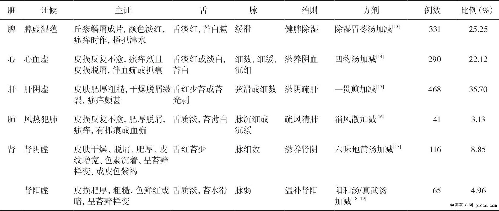 湿疹为中医“湿疮”范畴, 病因病机为禀赋不足, 风、湿、热阻于肌肤所致[8]。各代医家对湿疹所涉及的脏腑论述不一, 或从肺脾论治, 或从肝肾论治[9,10,11]。《千金要方》指出:“夫五脏六腑者, 内应骨髓, 外合皮毛肤肉”, 五脏的功能失调与疾病的发生发展密切相关, 因此本文以五脏辨证为基础, 根据湿疹的临床特征, 探索慢性湿疹发病与五脏证候传变规律, 为临床提供诊疗思路。