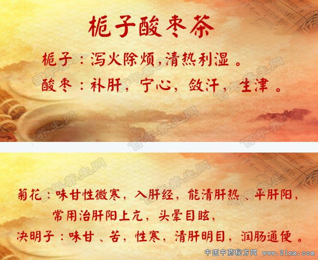 图:天麻钩藤饮 针对肝阳上亢,有难以入睡、睡中多梦、脾气暴躁的人群,专家推荐了栀子酸枣茶和菊花决明茶,原料可在药店购买。栀子酸枣茶:一般每天用炒栀子3-6克,酸枣15-30克,洗净后沸水浸泡5分钟即可饮用。根据个人习惯,每天可以浸泡多次饮用,建议饭后服用。脾胃虚寒,有胃病的人慎用。如果睡眠很不好的,也可以不用酸枣,直接用炒酸枣仁,但要适当煎煮。此款茶饮,能较好的清火安神,比如一些中年人由于工作压力大,焦虑上火,睡不好觉,都可以饮用。菊花决明茶:将洗净的决明子15g倒入热锅上小炒,直至水分蒸发,散发淡淡的清香,且有啪啪声即可关火。最好可以将炒好的决明子碾碎,加入菊花5-10g约20朵,一同用煮沸的开水冲泡,焖10分钟即可饮用。