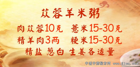图:暖脾助湿汤的制作方法 针对除寒湿,熊露主任推荐了苁蓉羊米粥。将肉苁蓉、精羊肉洗净细切,用砂锅加水煎煮肉苁蓉40分钟,取汁去渣,放入羊肉、粳米同煮,待煮沸后加入精盐、生姜、葱白、煮为稀粥即可。早餐或夜宵食用,具有补肾助阳,健脾养胃,润肠通便的功效。适用于肾阳虚所致的阳痿、遗精、早泄,女子不孕。各种习惯性便秘。夜间多尿、尿频、尿痛、遗尿等。