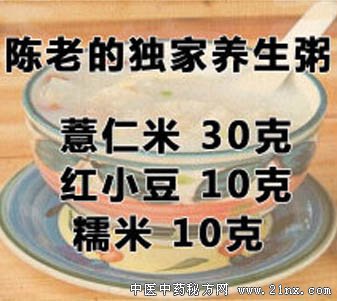 北京养生堂陈文伯养生粥 材料:薏仁米 30克、红小豆10克、糯米10克 洗净后一起熬粥40分钟后服用。 这个粥对于高血压、糖尿病的病人都有一定的保健作用,而且还有一定的防癌作用。