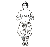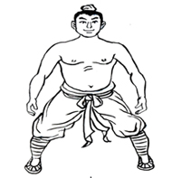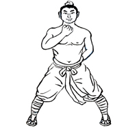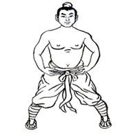 屈膝下蹲成大马步,身体保持正直。两手在体前捧起。