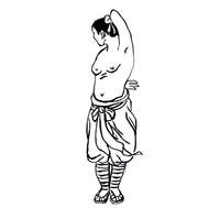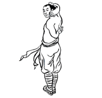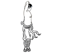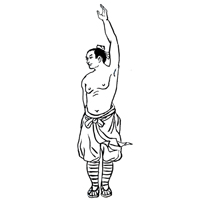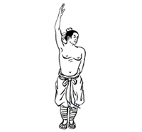动作要领:左手臂上举,夹抱头部。右掌大拇指向上抵住后心。