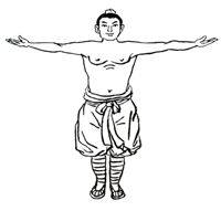 动作要领:两脚并拢,自上而下放松,舌抵上腭,两目平视。