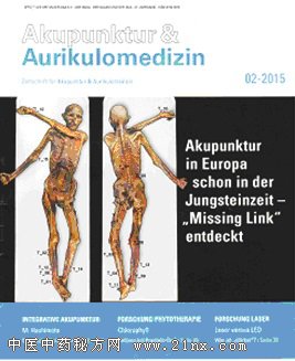1.4.1 德国的针灸研究 针灸是德国最早认识,也是接受最广泛的中医疗法。因此,对针灸的认识和研究也比较深入,尤其是对针灸镇痛的研究,充斥于医刊杂志、报纸电台等。比如在德国有名的杂志《明镜》(《Spiegel》)上可以找到很多有关针灸的学术文章,如:“Chronische Schmerzen: Akupunktur hilft. Aber warum?(慢性疼痛:针灸有帮助,但是为什么?)”,“Arthrose:Akupunktur hilft verzweifelten Kniepatienten(关节炎:针灸帮助绝望的膝病患者)”[1]。更为专业的针灸学术杂志也有很多,比如《Akupunktur》(《针灸》)、《Akupunktur & Aurikulomedizin》(《针灸和耳针医学》,见图2)等等。