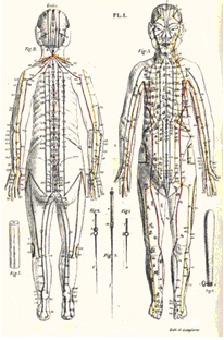 (Sarlandiere. Memoire sur l’electropuncture. Paris 1825.) 图1 1825年欧洲的经络穴位图
