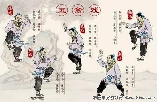 以模仿禽兽动作来达到健身目的的方法,最早见于战国时期。《庄子•刻意》有:“熊经鸟伸,为寿而已”的记载,至汉初《淮南子•精神训》则有:“熊经、鸟伸、凫浴、蝯**、**视、虎顾,是养形之人也”的说法,而五禽戏之名相传出自华佗。《后汉书•方术传》载,华佗云:“我有一术,名五禽之戏,一曰虎、二曰鹿、三曰熊、四曰猿、五曰鸟。亦以除疾,兼利蹄足,以当导引”。随着时间的推移,辗转传授,逐渐发展,形成了各种流派的五禽戏,流传至今。 ![]()