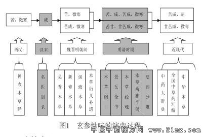 中药药性理论 [1] 是中医理论的重要组成部分, 包 括四气五味(性味) 、 归经、 升降浮沉、 毒性 [2] 等, 而 中药性味理论是中药药性理论的核心 [3] 。 目前, 一些 中药性味仍混淆不清, 无法确定哪种药味对获得的 结论有何种贡献, 难以深层次地阐明中药性味关系 及其精细结构。 如何既能阐明中药性味理论的科学 内涵, 又能保持和发扬中医药自身的特色优势, 一直 是中医药学者面临的艰巨任务和巨大挑战。 中药药 性理论经过几千年不同历史格局的差异变迁及阴阳 五行哲学思维的渗透, 有着相当复杂的演变历程, 使 得中药性味的形成具有复杂性、 多源性。 玄参为玄参科植物玄参 (ScrophuLaria ningpoensis Hemsl.) 的干燥根 [4] 。 始载于《神农本草经》 [5] , 列为 中品, “味苦, 微寒” , 而《中华人民共和国药典》记 载其为 “甘、 苦、 咸, 微寒” 。 为探究玄参单味转变为 复合药味的原因, 阐述玄参性味的科学本质, 本课题 组从历代56本古今医药本草著作所记载的纷繁的药 性理论和药性标识中, 系统搜集与玄参性味、 临床应用、 古今结合、 医药结合相关的记载, 对其性味进 行了本草考证研究, 理出玄参性味的发展脉络, 这 是深刻阐明玄参性味理论科学性所必须的文献准备 和理论前提, 对于构建玄参及其拆分组分的性味药 理学评价及指导临床实践和开展现代中医药学研究 有重要指导意义。 归纳总结其性味的历史演变过程 如图1。 ![]() 图1 玄参性味的演变过程 汉末 味的考证 1. 味 “苦” 的考证 玄参以单药味始载于《神农 本草经》 : “味苦, 微寒, 无毒。 主治腹中寒热积聚, 女子产乳余疾, 补肾气, 令人目明” 。 不同时期不同 医家对其 “苦” 味的认识基本一致, 整理56本著作 中有关玄参药味记载为55本, 其中52本均有 “苦” 味 记载, 占总比例的94.5%, 如《本草发挥》曰: “气寒 味苦。 治心中懊憹, 烦而不得眠, 心神颠倒欲绝, 血 滞, 小便不利” 。 《神农本草经百种录》 曰: “味苦, 微 寒。 主腹中寒热积聚, 皆火气凝结之疾……除阴分之 火, 则头目清明矣” 。 此外《本草经集注》 《药性论》 《开宝本草》 《证类本草》 《本草汇言》 《本草蒙筌》 《药性解》 《本草害利》 《玉楸药解》等均有相关记 载。 可见玄参 “苦” 味贯穿于整个性味演变史。 分析 其 “苦” 味的原因可能如下。 1.1 根据其真实滋味而定 《素问·藏气法时 论》 中 “五味” 实指5种真实的滋味; 《帝王世纪》 曰: “黄帝使岐伯尝味草木, 定 《本草经》 , 造医方, 以疗 众疾” ; 亦有 “神农尝百草之滋味, 一日七十毒” 的传 说。 可知 《本经》 中五味的确定与滋味有一定相关性。 口尝玄参饮片 [6] , 味甘微苦, 略似焦糖。 故推测 “苦” 味的确定与其口尝滋味有关。 1.2 根据临床治疗中反映出来的效果而定 苦 具有泻火、 泻下、 降逆、 燥湿之功 [7] 。 玄参功效为凉血 滋阴, 泻火解毒, 用于疮疡热痛、 下水、 瘰疬等, 其是 与 “苦” 味相关的功效。 因此推测 “苦” 味的确定与 其临床功效有关。 1.3 结合阴阳五行学说而定 《神农本草经》 是汉代儒家哲学、 神仙学说和阴阳五行学派思想影 响下的产物 [8] , 故 “五味” 属性的确定必然也受其影 响。 《本草经解》 云: “味苦无毒, 得地南方之火味” ; “东、 西、 南、 北、 中” 五方里面, 南方生热, 热生火; 五行中, 火生苦, 可见玄参苦味的确定当有五方五行 之依据。 《素问·阴阳应象大论》中载: “味厚者为 阴, 薄为阴之阳。 气厚者为阳, 薄为阳之阴” 。 玄参色 黑有液而后味厚, 为阴中之阴, 推断其味 “苦” 。 2. 味 “咸” 及 “苦、 咸” 复合药味的考证 《名医 别录》 [9] 载玄参: “味咸, 无毒。 主治暴中风、 伤寒, 身 热支满, 狂邪、 忽忽不知人, 温疟洒洒, 血瘕, 下寒血, 除胸中气, 下水, 止烦渴, 散颈下核, 痈肿, 心腹痛, 坚 症, 定五藏” 。 书中未记载玄参 “苦” 味, 但所述临床 功效已体现 “苦、 咸” 复合药味, 明清时期各医家著作 大都以玄参 “苦、 咸” 复合药味记载。 探究玄参 “苦、 咸” 复合药味出现的原因可能是医家在对玄参苦味功 效认识的基础上有了新的临床发现 “散结气而能软 坚, 故主瘰疬也。 散结凉血降火, 故解斑毒, 利咽喉 也” , 即玄参主瘰疬、 解斑毒、 利咽喉与 “咸” 味有关; 《本经》 中 “苦能下气, 寒能除热, 咸能润下软坚, 故 主腹中寒热积聚, 女子产乳余疾” , 其作用与苦咸之 味有关。 可见玄参味 “咸” 的确定及 “苦、 咸” 复合药 味的应用应该是随着临床应用范围的扩大, 使得各医 家对其功效有了更进一步的认识。 3. 味 “甘” 及 “甘、 苦、 咸” 复合药味的考证 玄 参味 “甘” 多见于明清至今, 如《景岳全书》 《玉楸 药解》 《药性切用》 《药品化义》 《医学衷中参西录》 《中药大辞典》 《中华本草》 、 2015版 《中华人民共和 国药典》中均有记载。 玄参 “甘” 味确定的原因可能 是明清后开始以功能类推定味的方法得出, 如《景岳 全书》云: “味苦甘微咸, 气寒。 此物味苦而甘, 苦能 清火, 甘能滋阴。 以其味甘, 故降性亦缓” ; 《药品化 义》云: “凡治肾虚, 大有分别, 肾之经虚则寒而湿, 宜温补之; 肾之脏虚则热而燥, 宜凉补之; 独此凉 润滋肾, 功胜知、 柏, 特为肾脏君药” ; 《神农本草经 读》云: “元参主产