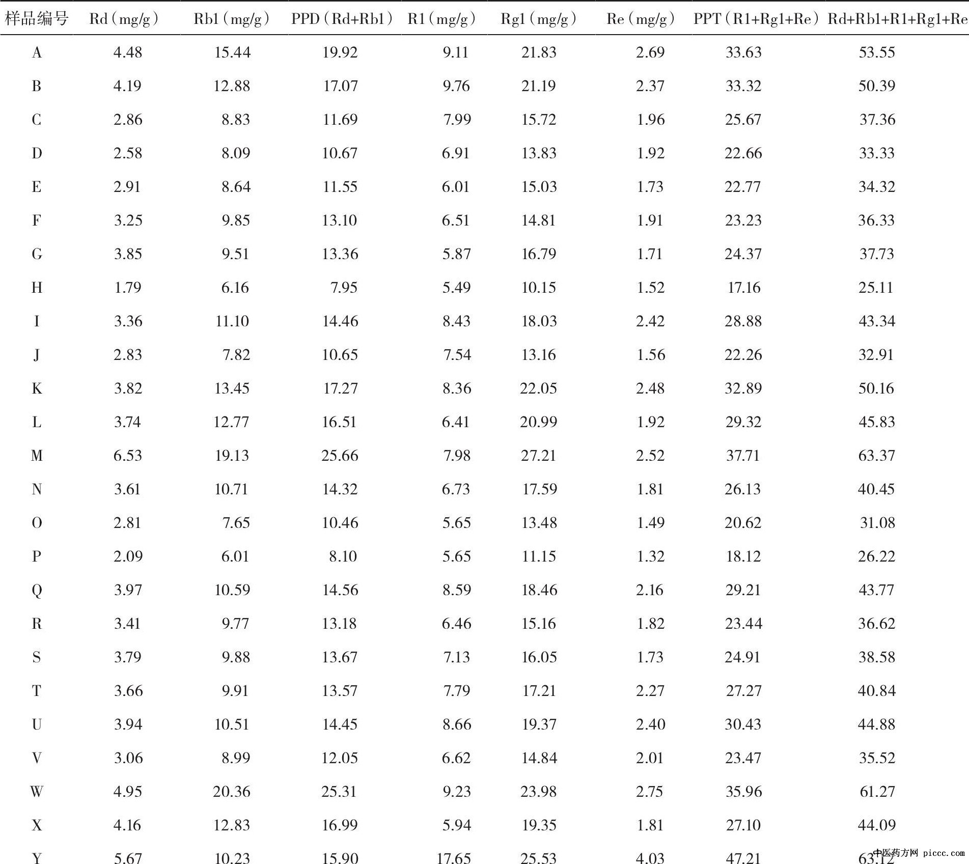 6.样品含量测定取炮制好的样品各0.25g, 精密称定, 分别按“3.2”项下方法制备供试品溶液, 照“2.”项色谱条件进样测定, 根据回归方程计算人参皂苷Rg1、Rb1、Re、Rd和三七皂苷R1的含量及5个单体含量总和。结果见表1, 样品色谱图见图1。