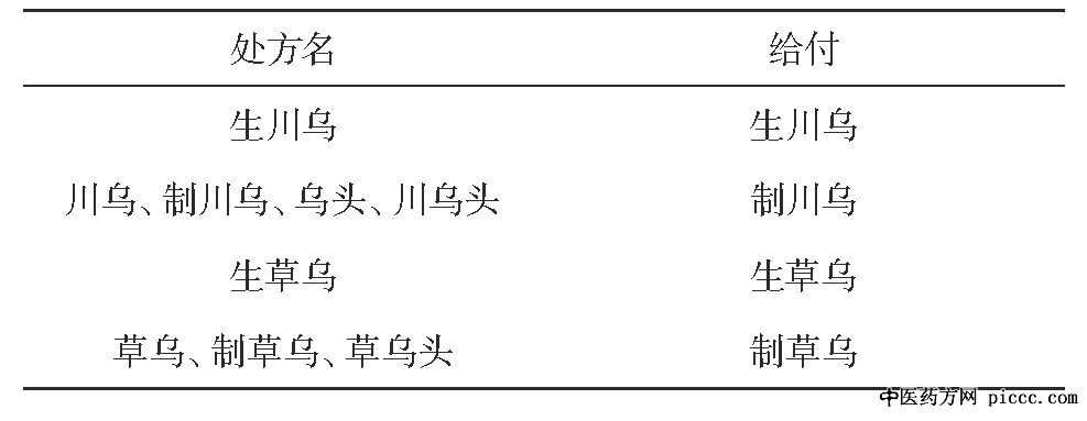 2.川乌、草乌的处方名汇总川乌、草乌生品有大毒, 多外用;炮制后可供内服[11]。川乌、草乌在性味归经、功能主治、用法用量、注意事项上相同, 但两者有着本质的区别, 因此在处方应付时应严格予以区分[12]。川乌、草乌的写法, 应以《中华人民共和国药典》、各省炮制规范的名称为准。现参考《中华人民共和国药典》 (2015版) 、《江苏省中药饮片炮制规范》、《实用中药学调剂手册》将川乌、草乌处方名、给付汇总, 见表2。