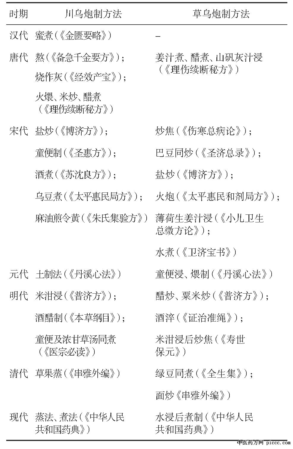 川乌、草乌炮制文献始于汉代, 唐朝以前对川乌、草乌的处理较为简单。宋朝开始, 川乌、草乌的炮制方法逐渐增多, 绝大多数先水浸后再加不同的辅料炮制, 主要有盐炒、酒煮、童便制等。到了明、清两代, 不但继承了宋代的炮制方法, 而且又发展了草果蒸、绿豆同煮的方法。川乌、草乌炮制方法历史沿革见表1。金世元教授认为, 虽然川乌、草乌的炮制方法众多, 但炮制的目的只有一个, 就是降低毒性, 保证临床用药安全有效。而这与《本草纲目》中所述的“或生用或炮用, 或以乌大豆同煮熟, 去其毒用”是一脉相承的。