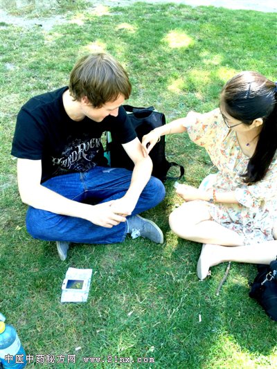 交流小组的领队Macros是个德国人,在见到他的第一天,同学们就对他做了关于中医药认知度的问卷调查,遗憾的是当时他对中医没有什么了解,仅仅听说过针灸,并且表示不愿意接受针灸作为辅助治疗手段。在一起学习、交流的一个月中,同学们常常向他介绍中医理论、演示针灸操作。在交流项目接近尾声时,Macros表示希望体验一次针灸治疗。同学们用一次性针灸针为他进行曲池穴针刺,Macros说感觉前臂都有胀、麻的感觉,觉得中医针灸很神奇,令他折服。