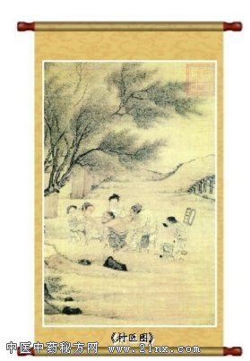 图中的环境正是在村头大树下,近处是农家院落,远处是小桥流水,村医是在野外草地上进行医疗活动,有大树遮阴,符合走方郎中随处施治的特色,反映了穷苦百姓求医的真实情况。