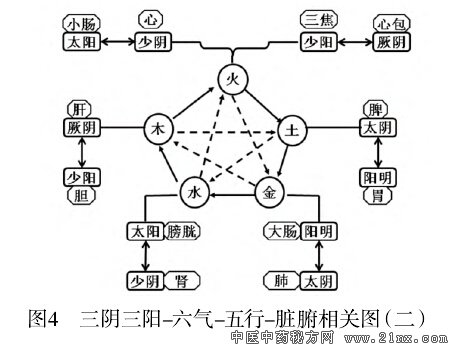 人身之中脏腑经脉均有特定的三阴三阳名称。 如《灵枢·经脉》中提及“肺手太阴之脉”“大肠手阳 明之脉”“胃足阳明之脉”“脾足太阴之脉”等有关 手足十二经脉及相关脏腑之名,均直接以三阴三阳 之名,即太阴、少阴、厥阴、太阳、阳明、少阳冠之。 但是,在《黄帝内经》(以下简称《内经》)中,并无任 何篇章直接论及是依据什么方法将不同的脏腑经脉 与三阴三阳联系起来,后世医家亦未能就此有清晰 的补充。 问题的提出 1. 三阴三阳,气有多少 三阴三阳之名是依据 《素问·至真要大论》所云“气有多少异用”之原理 而来的。按阴阳气由少而多排列,分别为厥阴(一 阴)、少阴(二阴)与太阴(三阴),及少阳(一阳)、 阳明(二阳)与太阳(三阳)。故《素问·天元纪大论》 云:“阴阳之气,各有多少,故曰三阴三阳”。若以此 为标准来认识脏腑经脉之三阴三阳,则具有特定名 称之脏腑及经脉应该能反映出其阴阳气有多少不 同。譬如,肺手太阴之脉,应该是肺及其经脉之阴气 最多,其余依此类推。但实际上,在认识脏腑经脉之 阴阳气时,并不能如此简单地将其与所相关的三阴 三阳对等起来。 《素问·血气形志篇》又指出:“夫人之常数,太 阳常多血少气,少阳常少血多气,阳明常多气多血; 少阴常少血多气,厥阴常多血少气,太阴常多气少 血。此天之常数也”。若以此而言,则人身之三阴三 阳又不以阴阳气之多少分,而是以气血多少分。若将 气血分阴阳,气为阳而血为阴。再将“气为阳”与“血 为阴”作一关联,则会出现另一种状态。即:太阳常 多血少气,则太阳常多阴少阳;少阳常少血多气,则 少阳常少阴多阳……如此一来,与上述三阴三阳所反 映之阴阳气多少更加不一致。 清朝医家周学海在其《读医随笔》中曾就《三 阴三阳名义》作专门论述,提出“三阴三阳者,天之 六气也,而人身之血气应焉。然血气之行于身也,周 流而无定,而三阴三阳之在身也,有一定之部份…… 人身三阴三阳之名,因部位之分列而定名,非有血气 之殊性以取义也” [1] 。特别强调“经络之三阴三阳, 以其所行部位分表里言之也;脏腑之阴阳,以其脏 腑之本气刚柔清浊言之也” [1] 。迄今为止,有关三阴 三阳之命名基本上都是从经脉所行之部位为认识的 切入点。 2. 经脉名称与循行位置 《中医基础理论》 教材在介绍十二经脉时会根据十二经脉在四肢的 循行部位,指出“分布于四肢内侧面的经脉,属阴 经;分布于四肢外侧面的经脉,属阳经” [2] 。内侧分 三阴,外侧分三阳,则太阴、阳明在前缘;少阴、太 阳在后缘;厥阴、少阳在中央。当经脉之三阴三阳 确定之后,与经脉相关的脏腑就自然而然地随之而 有同名。但教材却没有说明为什么经脉会有如此的 循行分布。若果真依经脉所在位置而分三阳三阴, 则三阳之序为阳明(二阳)、少阳(一阳)与太阳(三 阳),而三阴之序则为太阴(三阴)、厥阴(一阴)与 少阴(二阴)。如此,则显而易见与三阳三阴所代表 之“阴阳之气,各有多少”之序并不相符。 现代的一些研究曾试图从阴阳气之多少来解释 手足三阴三阳经脉的这种分布特点,如赵喜新等 [3] 提出首先根据五脏六腑所处部位确定其阴阳气之多 少,然后将之与相关的经脉相联系而确定经脉三阴 三阳之名;叶庆莲 [4] 则认为先定下人身结构之三阴三 阳名称,再结合阴阳气之多少,根据经脉所在部位及阴 阳气多少而命名经脉三阴三阳;朱小俊 [5] 则认为经脉 在四肢前、中、后的分布是遵照阴阳平衡之规律而形成 的。但无论那一种认识,都有一个共同之处,就是在 阴阳气多少与三阳命名上,都认为“阳明”之阳气最 盛,为三阳;“太阳”次之,为二阳;“少阳”则最少, 而为一阳。这与《内经》中有关太阳为三阳、阳明为 二阳之认识是完全不同的。例如《素问·阴阳类论》 中直接有“所谓三阳者,太阳为经”、“ 所谓二阳者, 阳明也”以及“一阳者,少阳也”之提法。所以,建立 在以阳明为三阳、太阳为二阳基础上的分析,其前提 必须是先修正太阳与阳明之属性,这与《内经》是不 相符合的。 脏腑经脉之三阴三阳命名到底是随意而无特定 意义?抑或刻意而有其特殊意义?始终是中医学在 理论层面需要解决的一个大问题。如果不能在理论 上说明脏腑经脉之三阴三阳命名的原理,就会导致 如周学海所说的“十二经之三阴三阳之为借名矣” [1] 的结论,即十二经脉不过是借三阴三阳之名而实际 上与三阴三阳无关。从这一结论再推下去,则脏腑经 脉亦不过是借阴阳之名而已。如果处于人身功能系 统中心的脏腑经脉都只是借阴阳之名,那么,整个中 医学中阴阳这一最核心的概念恐怕就没有意义了。所 以说,这是中医学在理论层面需要解决的一个大问 题。而对于这么大的一个学术问题,竟然甚少有专门 的研究报告,不能不说是很大的遗憾。 天地阴阳与脏腑之相应关系 《灵枢·海论》指出:“夫十二经脉者,内属于腑 脏,外络于肢节”。在《灵枢·经脉》中论及手足十二 经脉之循行时,最后必定要将其“属”于某一特定 的脏腑,譬如“肺手太阴之脉,起于中焦,下络大肠, 还循胃口,上膈属肺”。由于脏腑是经脉之根本,因 此,要思考脏腑经脉是如何与三阴三阳发生特定关 系这一问题,就必须先回到天地阴阳与脏腑的关系 上来。 1. 五脏应四时、五行 《素问·宝命全形论》 谓:“人生于地,悬命于天”,指出了应该将生