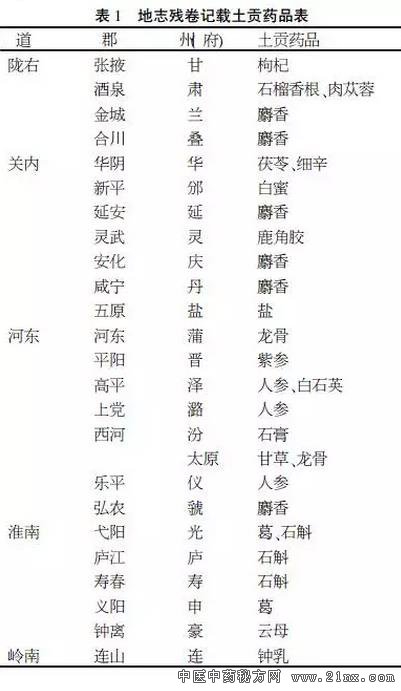 敦煌遗书地志残卷[7],现藏甘肃省敦煌县博物馆。首尾俱残,墨笔抄写。从同谷郡成州(属陇右道,道名残缺)起始,依次为陇右道残存16州,关内道24州,河东道19州,淮南道14州,岭南道65州,止于贺水郡澄州,共计138州。各州名下用小字记载距京都里程、土贡及公廨本钱数,下写该州所属县名。土贡部分包括吃穿用品、矿产、药名和手工艺品。以此卷和《唐书·地理志》校对,该卷中有天宝元年更名的郡、县名,而未见天宝七年以后新置属县,可确定其书写年代在天宝初期(公元742—749年),当时全国共有郡州328个,残卷约存载了42%。记载的土贡药名共19种,涉及25个州,占地志总州数的18%。(见表1)