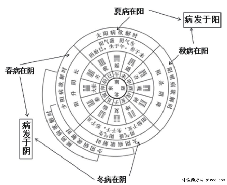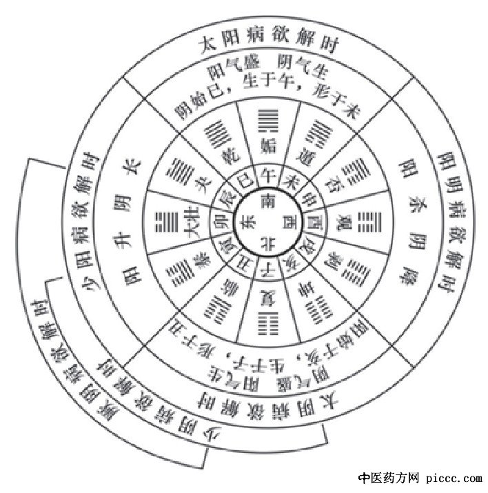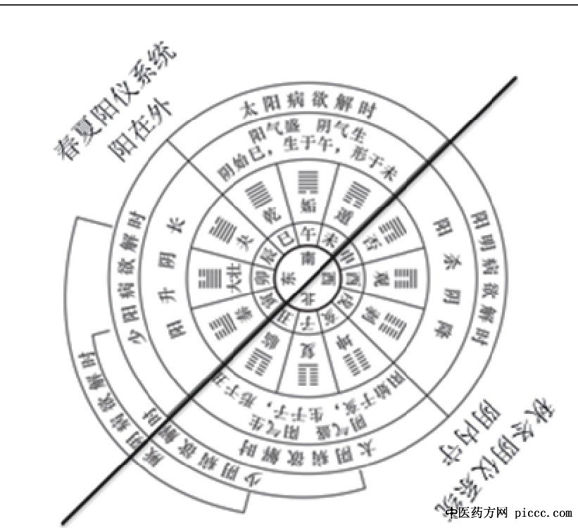 《伤寒论》第9条:“太阳病, 欲解时, 从巳至未上”;第193条:“阳明病, 欲解时, 从申至戌上”;第272条:“少阳病, 欲解时, 从寅至辰上”;第275条:“太阴病, 欲解时, 从亥至丑上”;第291条:“少阴病, 欲解时, 从子至寅上”;第328条:“厥阴病, 欲解时, 从丑至卯上”。根据《伤寒论》的这些叙述, 可以绘制出图1。六经病欲解时三阴三阳体系, 属于“人中之阴阳”, 用于阐述人体发病及发病部位、疾病发展趋势, 其中有阳仪系统、阴仪系统、病发于阳、病发于阴之别[2], 见图2-图3。